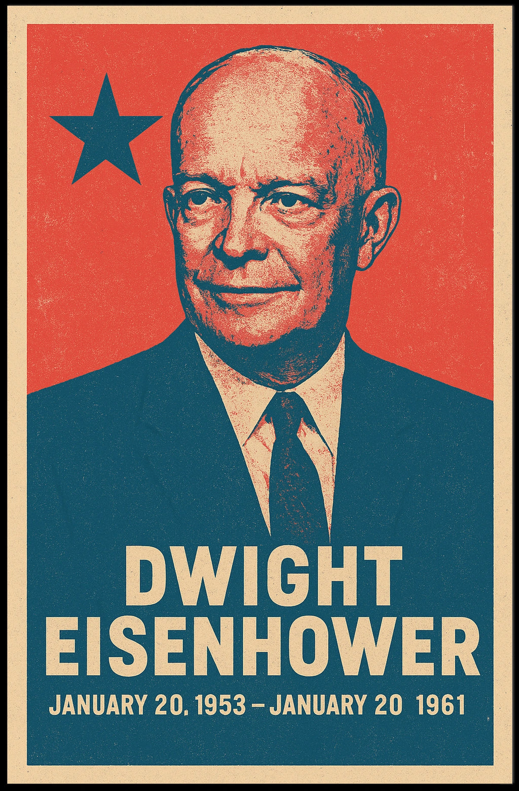 This mid-century-inspired poster pairs a bold typographic treatment with a stylized Eisenhower portrait, highlighting leadership symbolism and American pride. It is designed to be a conversation piece that enhances any wall with cultural significance and historical context.