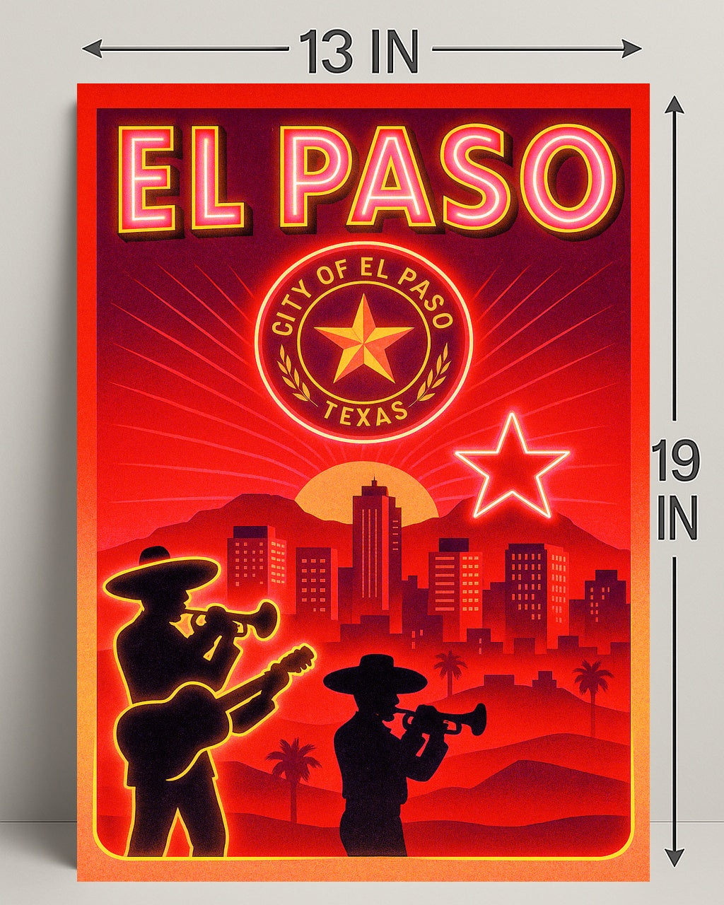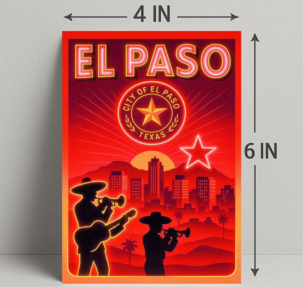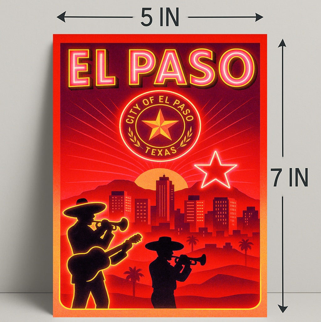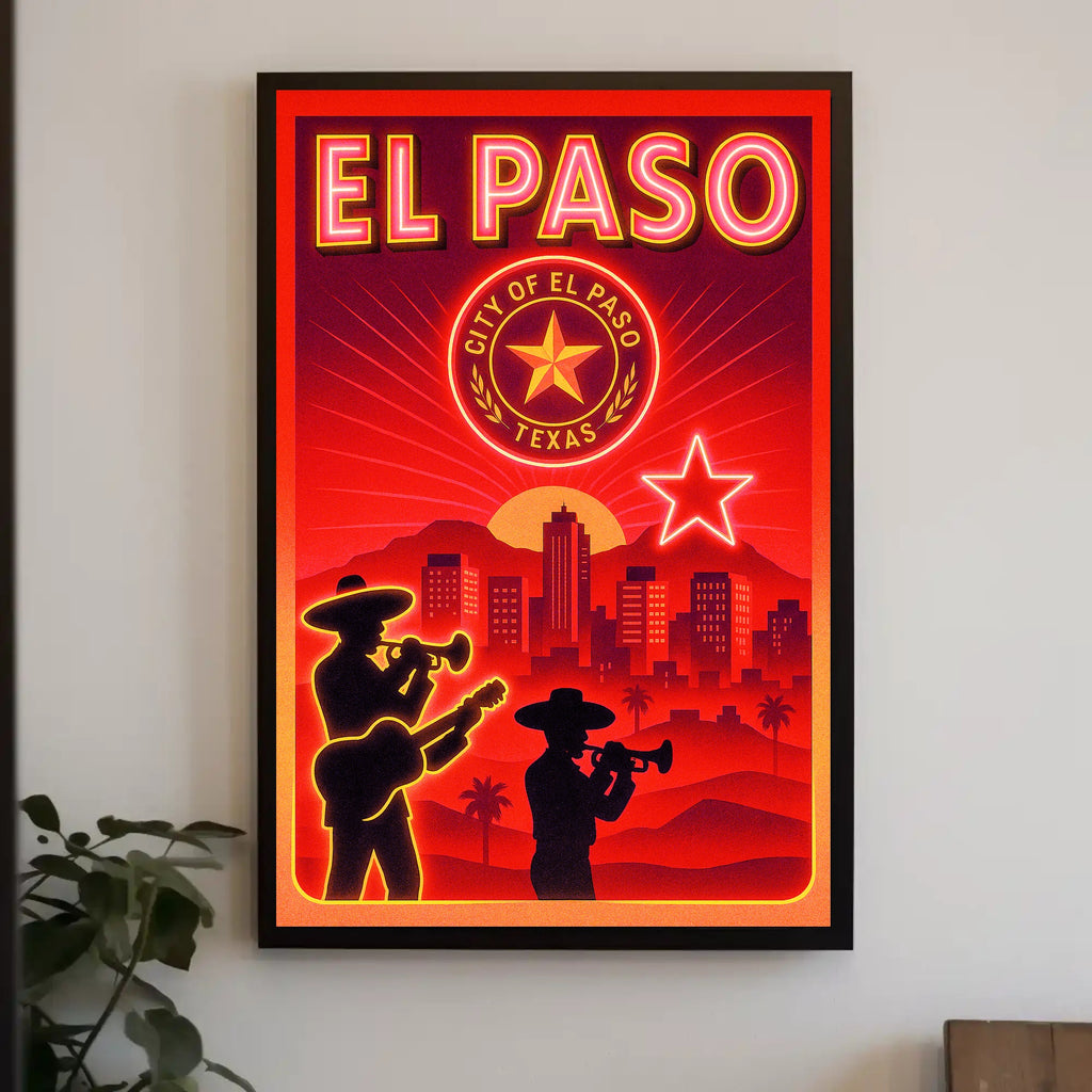 Capture the vibrant spirit of the Southwest with the El Paso Cityscape Poster from PosterGoat — a striking piece of wall art that blends retro neon vibes with modern minimalist design. Rich reds and glowing orange highlights frame a sunset city skyline, silhouetted mariachi musicians, palm trees, and a bold Texas star and seal — perfect for adding warmth and personality to living rooms, offices, or travel-inspired galleries.