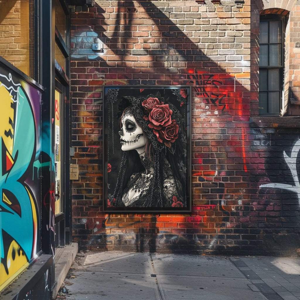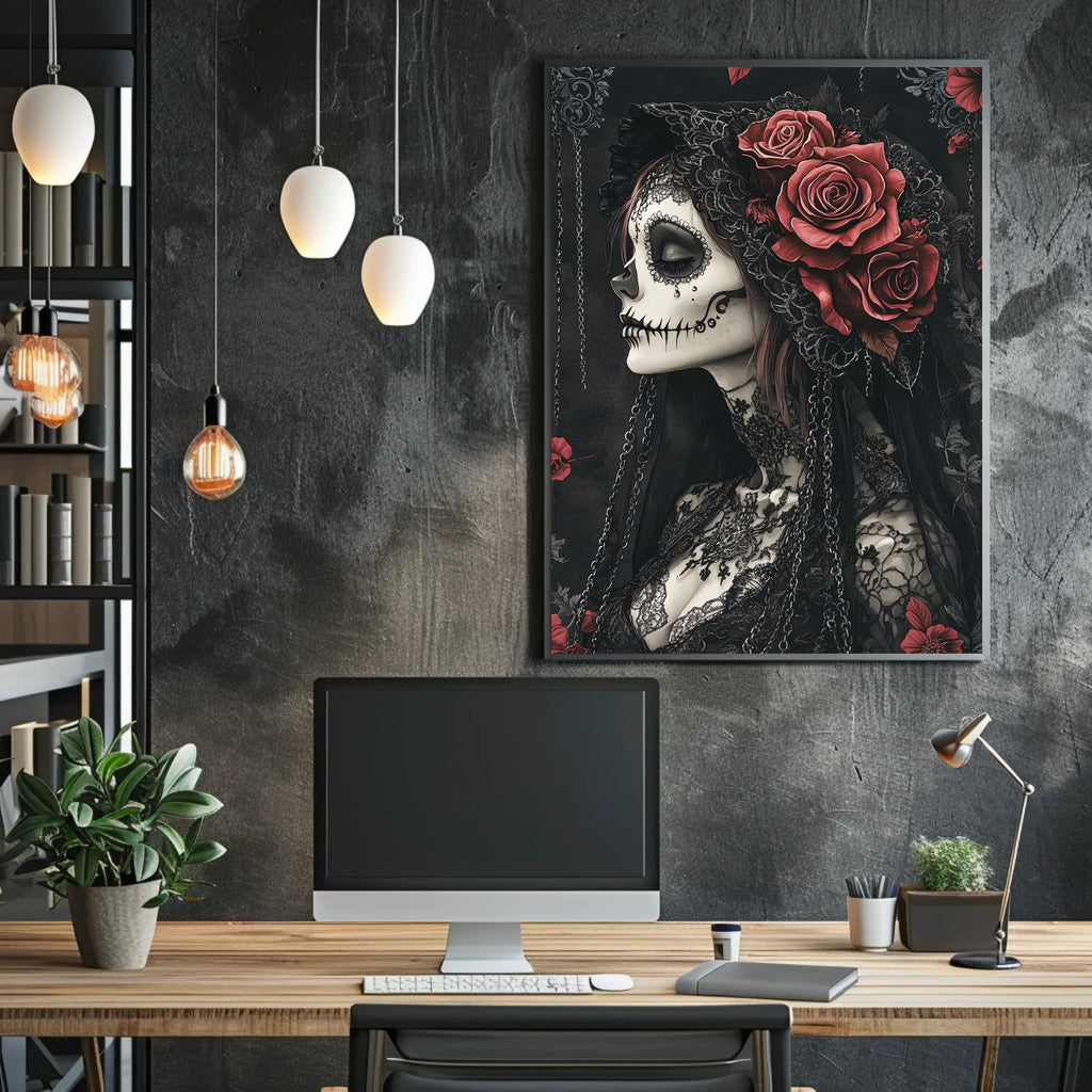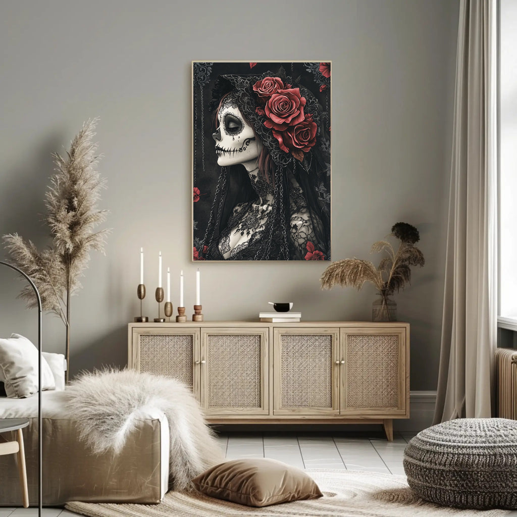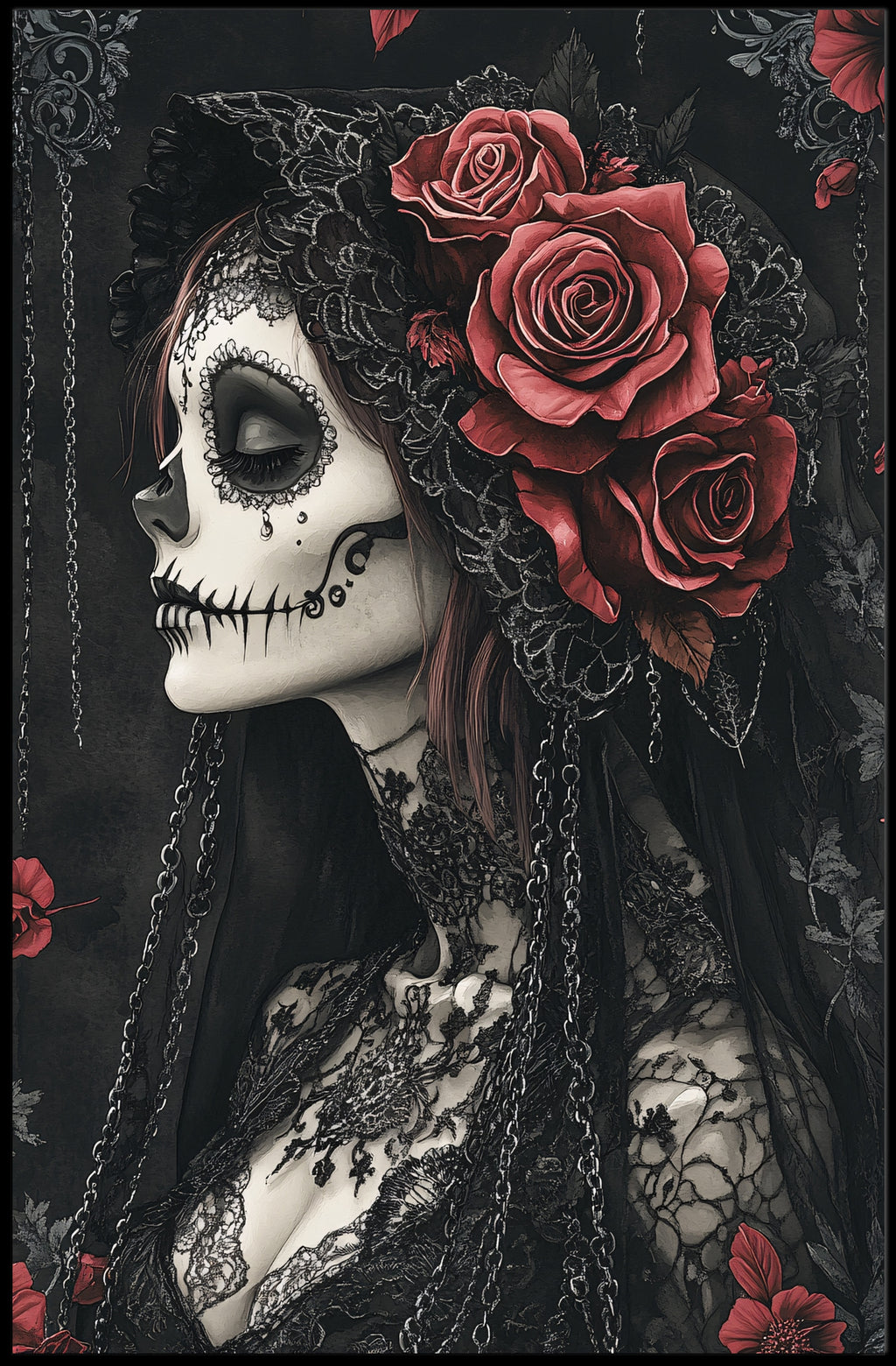 Elegance In Darkness Poster from PosterGoat blends gothic romance and minimalist artistry to create a striking focal point for any room. This dramatic wall art features a profile portrait with intricately detailed skull-inspired makeup, delicate lace textures, cascading chains and lush red roses — all rendered in deep blacks and muted tones for a timeless, cinematic look.