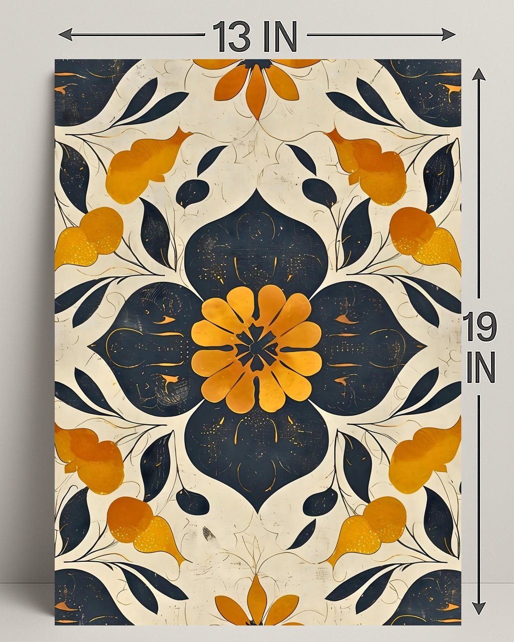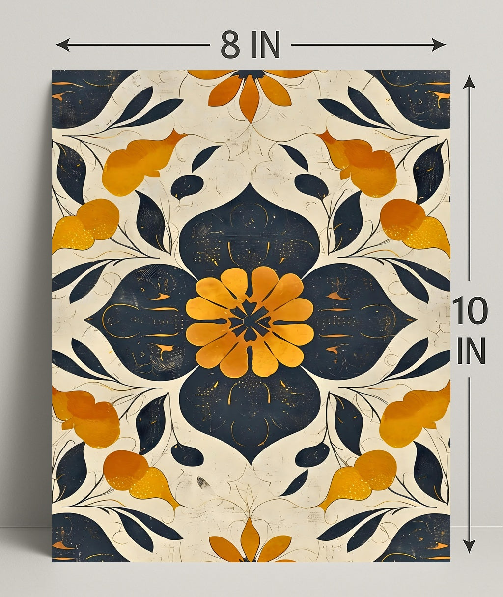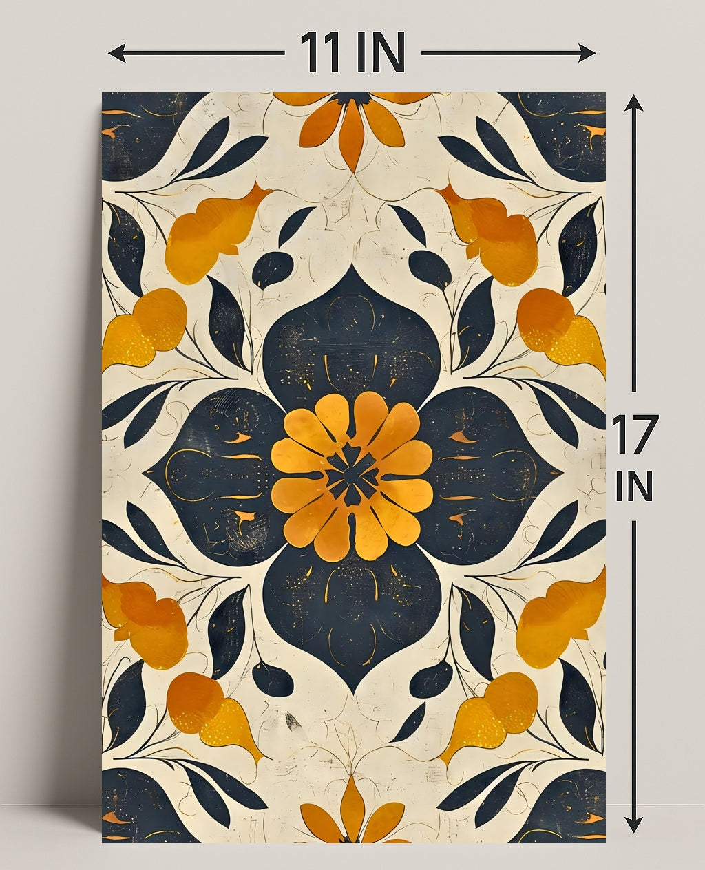 Elegant Abstract Floral Design: Artistic Poster from PosterGoat blends vintage collage charm with contemporary abstraction to create a striking focal point for any room. This poster features a symmetrical floral motif—deep navy petals and a warm golden-orange center—set against a distressed cream background for a handcrafted, timeless look.