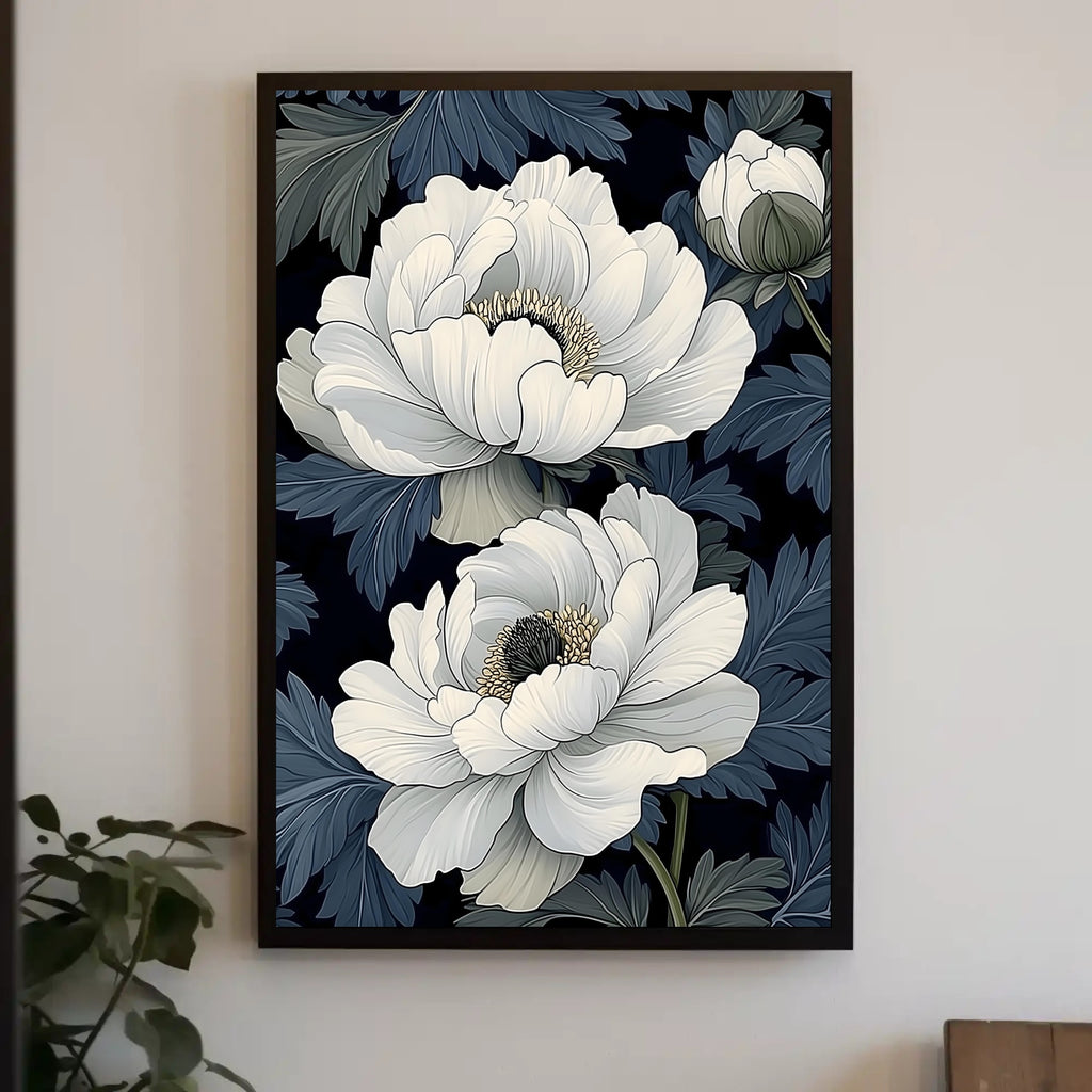 Bring timeless elegance to your walls with the Elegant Floral Design Wall Art Print from PosterGoat. This minimalist, artful poster showcases two large, hand-illustrated white blooms set against deep, moody foliage—an eye-catching focal point that elevates living rooms, bedrooms, hallways, and home offices.