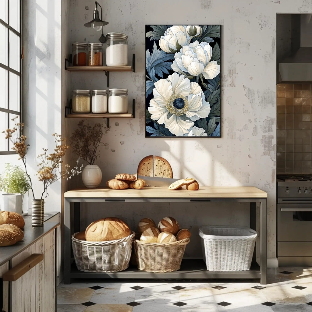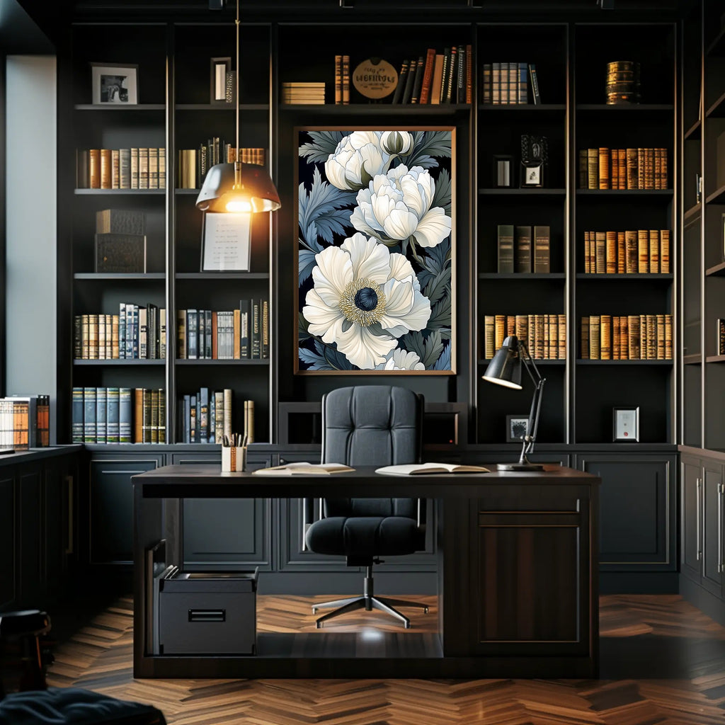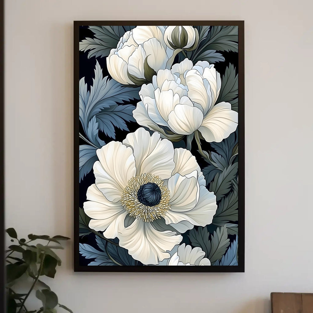 Artful design: This print features oversized, ivory floral blooms rendered with fine line work and soft shading against a deep, near-black backdrop. Lush blue-green foliage and layered petals create depth and movement, making the piece a captivating focal point in living rooms, bedrooms, hallways, or office spaces.