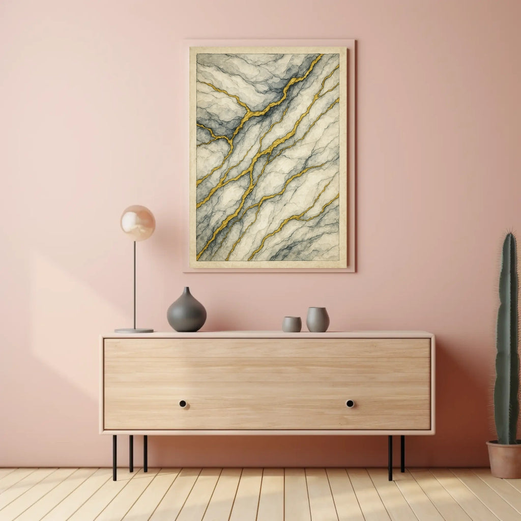 Elegant Marbled Kintsugi Design: Abstract or Artistic Poster celebrates the beauty of imperfection with a captivating abstract composition that blends gray and white tones with enchanting gold veins inspired by the Japanese art of Kintsugi. The result is a refined piece that exudes elegance, serenity, and a timeless appeal for any space.