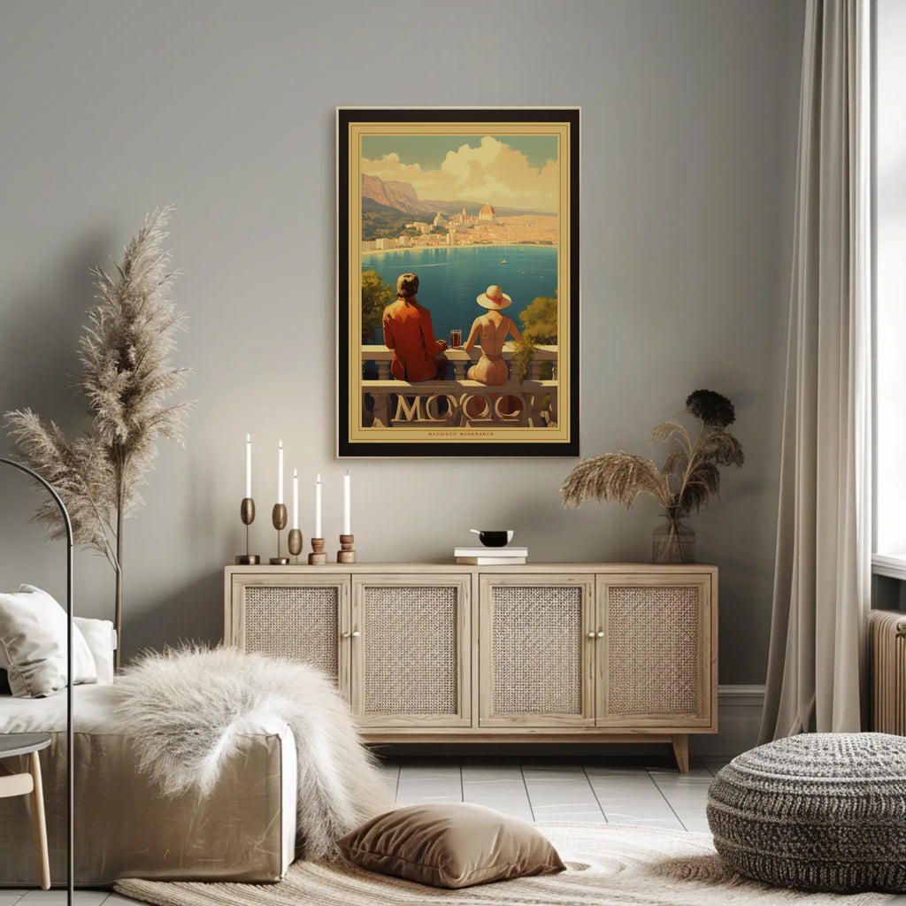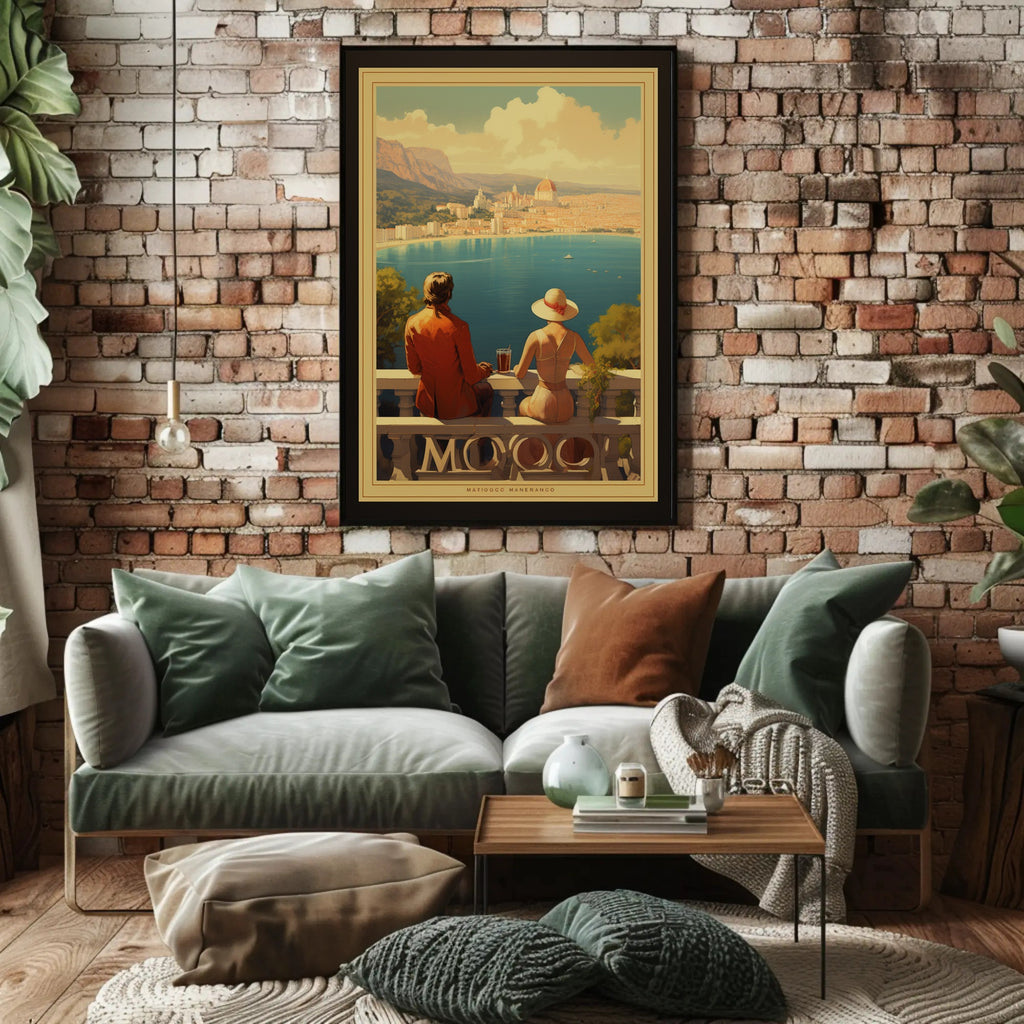 This stunning poster captures a timeless Mediterranean coastal scene, showcasing a man and woman in elegant early to mid-20th-century attire. Set against a backdrop of classic European architecture, the couple relaxes on a balcony with a breathtaking view of a seaside city, complete with a domed building reminiscent of the Italian or French Riviera. The artwork exudes a vintage romantic charm, employing warm tones and detailed illustrations to evoke feelings of nostalgia and elegance. Ideal for those who appreciate travel, romance, and the allure of classic European landscapes, this piece brings serene beauty to any space.