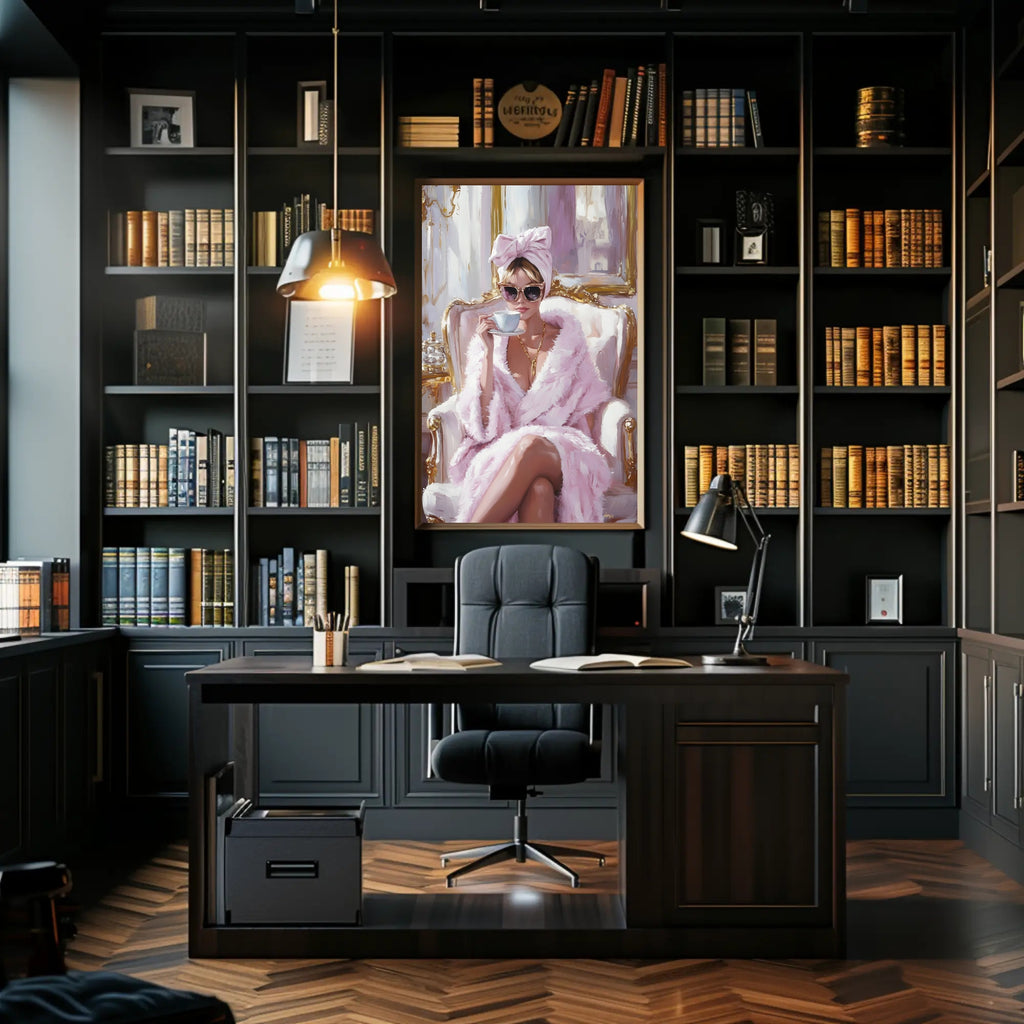 Striking visual details: textured brushwork, plush pink fur robe, oversized sunglasses, delicate teacup, and gilded chair framing—designed to catch the eye and invite calm.