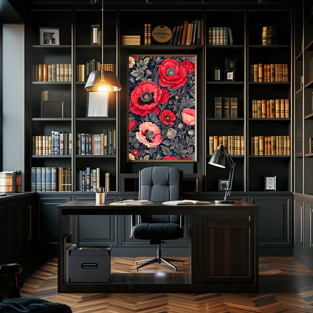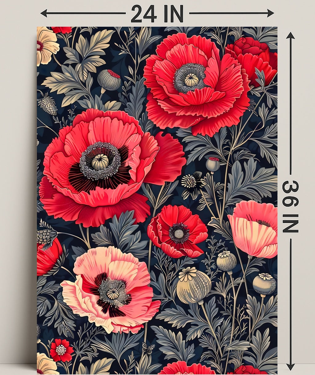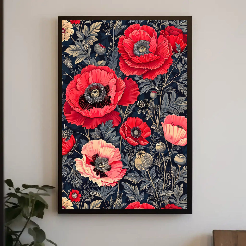 Transform your living space with the Elegant Red Poppies Artwork from PosterGoat. This exquisite poster showcases the breathtaking beauty of vibrant red and pink poppies, meticulously detailed against a dark, dramatic background. The perfect blend of modern and vintage, this artwork brings a touch of classic botanical elegance to any room.