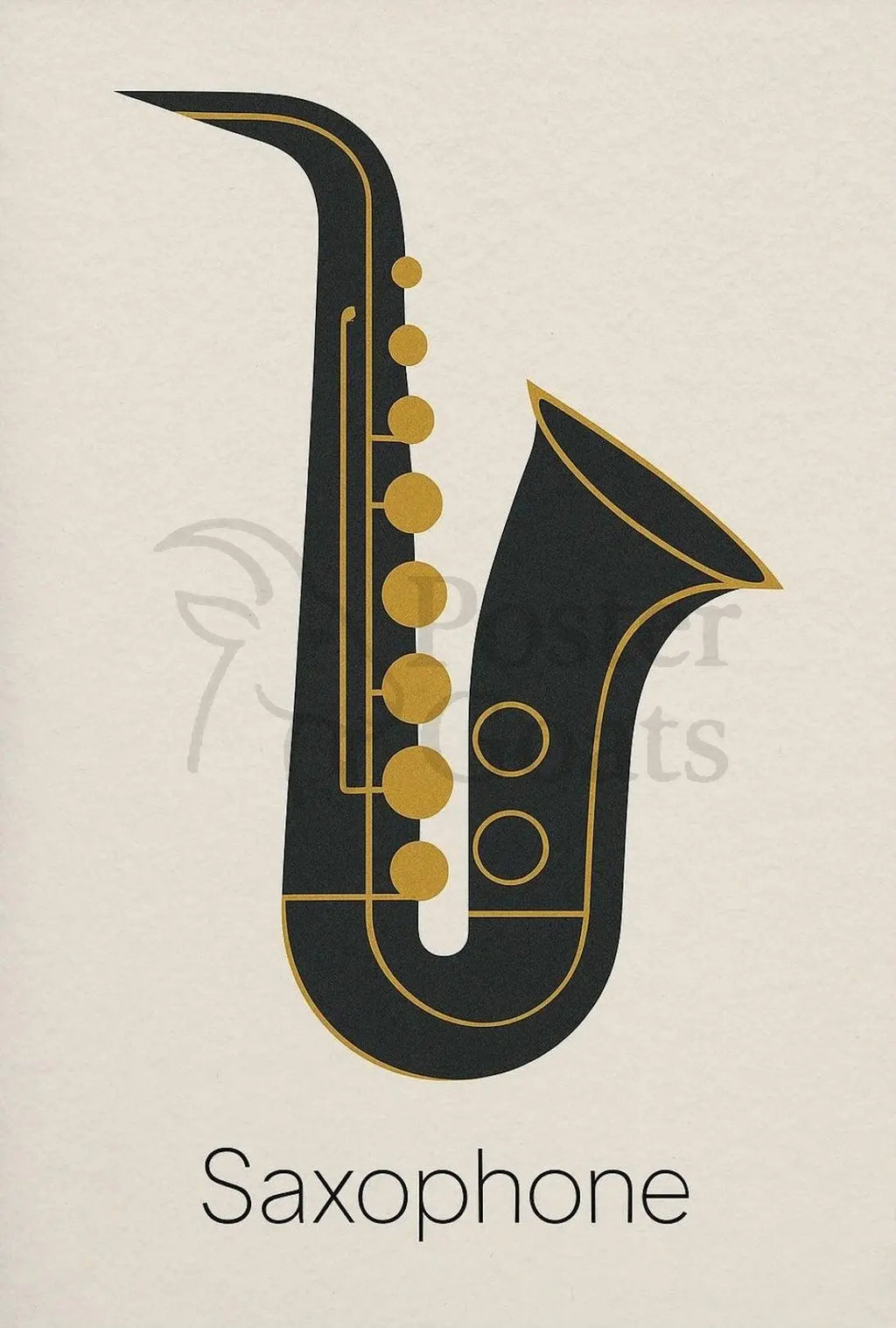 Clean, sophisticated and instantly recognizable — this Elegant Saxophone Minimalist Design Artistic or Pop Culture Poster from PosterGoat brings musical charm to any room. The bold black silhouette of a saxophone is outlined in refined gold accents against a textured cream background, creating a striking focal point that suits modern, minimalist and music-themed interiors.