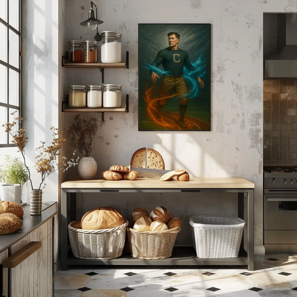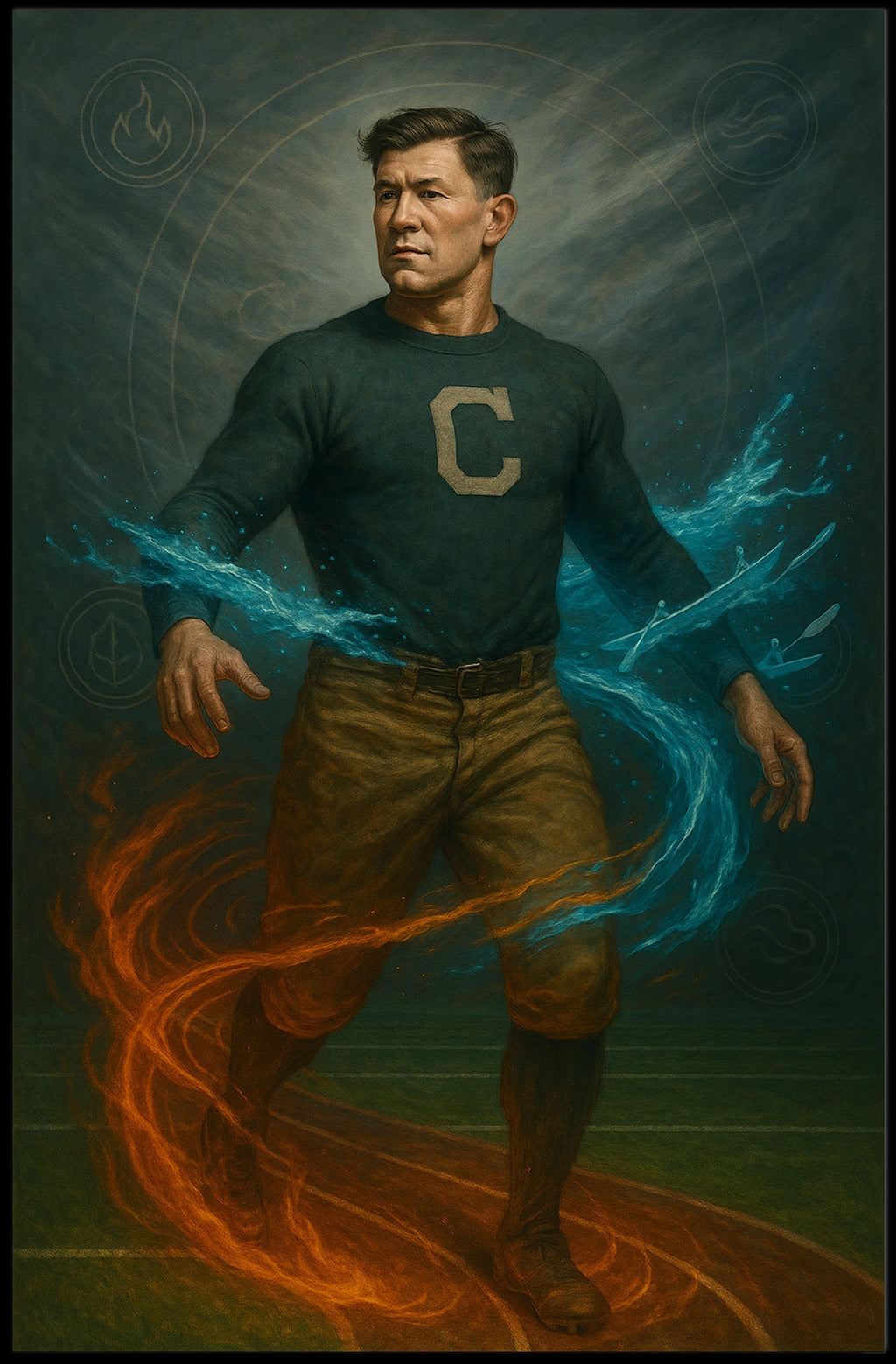 Introducing the Elemental Athlete Art Jim Thorpe Poster—a bold fusion of strength and nature that elevates any room. This vintage-inspired portrayal of a legendary athlete radiates mastery and balance, enhanced by fiery and fluid water motifs. Ideal for fans of heroic decor, heroism wall art, and inspirational decor, it brings motivation, focus, and a timeless aesthetic to living spaces, gyms, or studios.