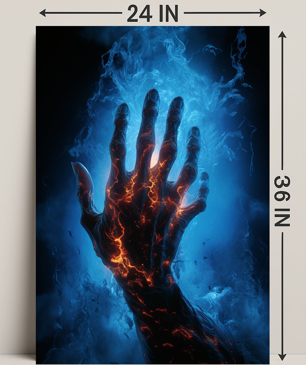 Bring elemental power to your walls with the Elemental Hand Poster from PosterGoat — a striking, minimalist artwork that fuses molten energy and cool blue atmosphere into a single dramatic scene. This high-impact poster showcases a detailed, upward-reaching hand veined with glowing lava-like fissures set against swirling cyan flames, creating instant focal interest in any room.