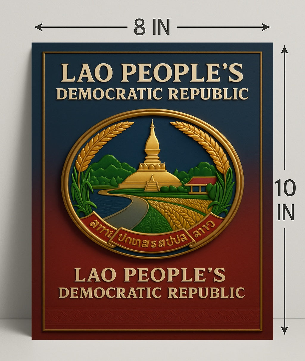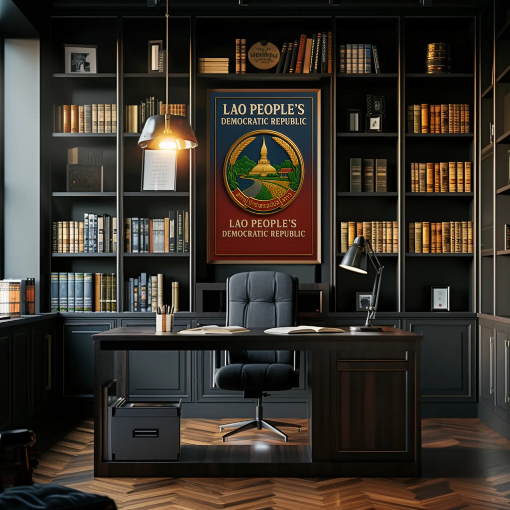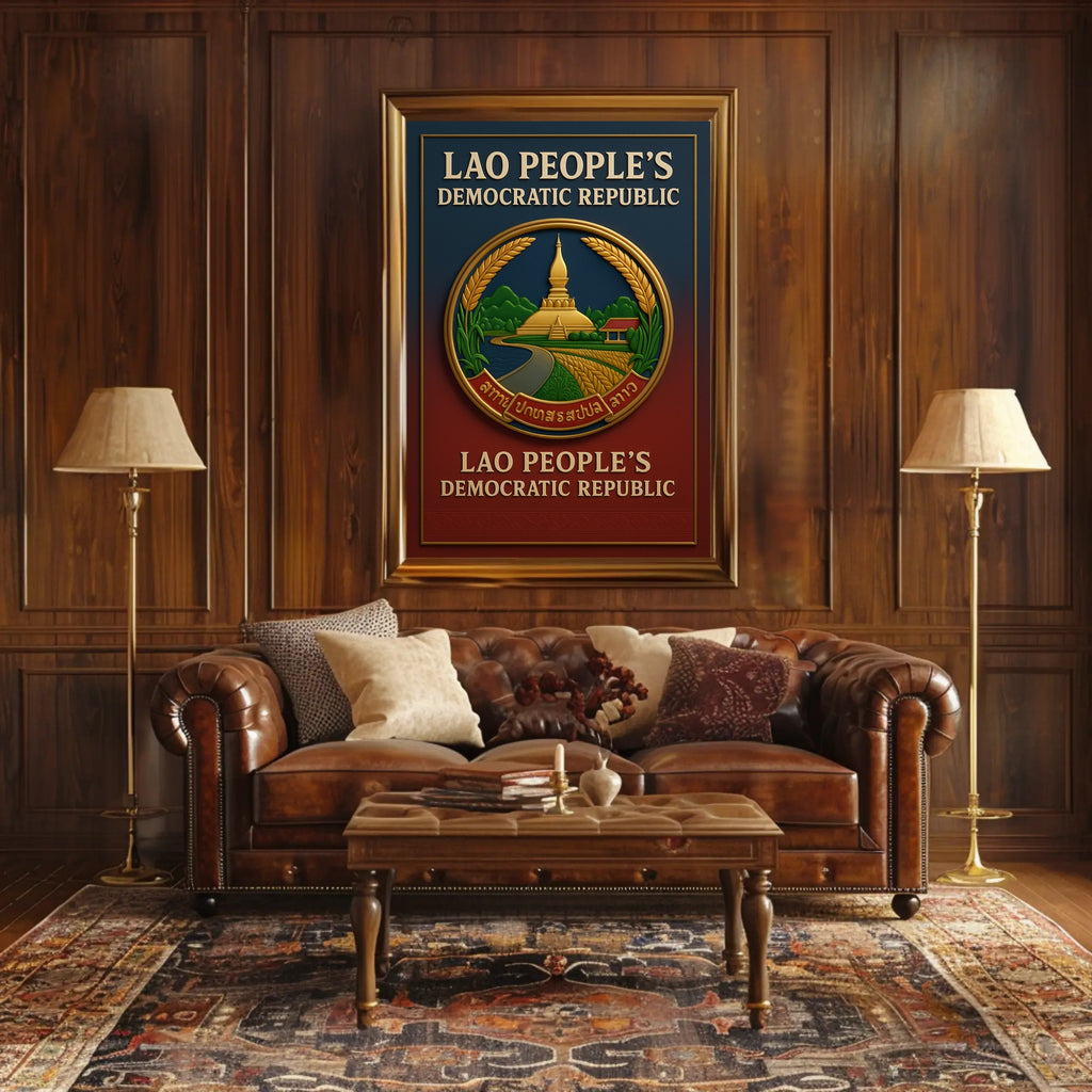 Stunning Design: This poster features a beautifully detailed emblem, embodying the spirit and heritage of the Lao Peoples Democratic Republic.