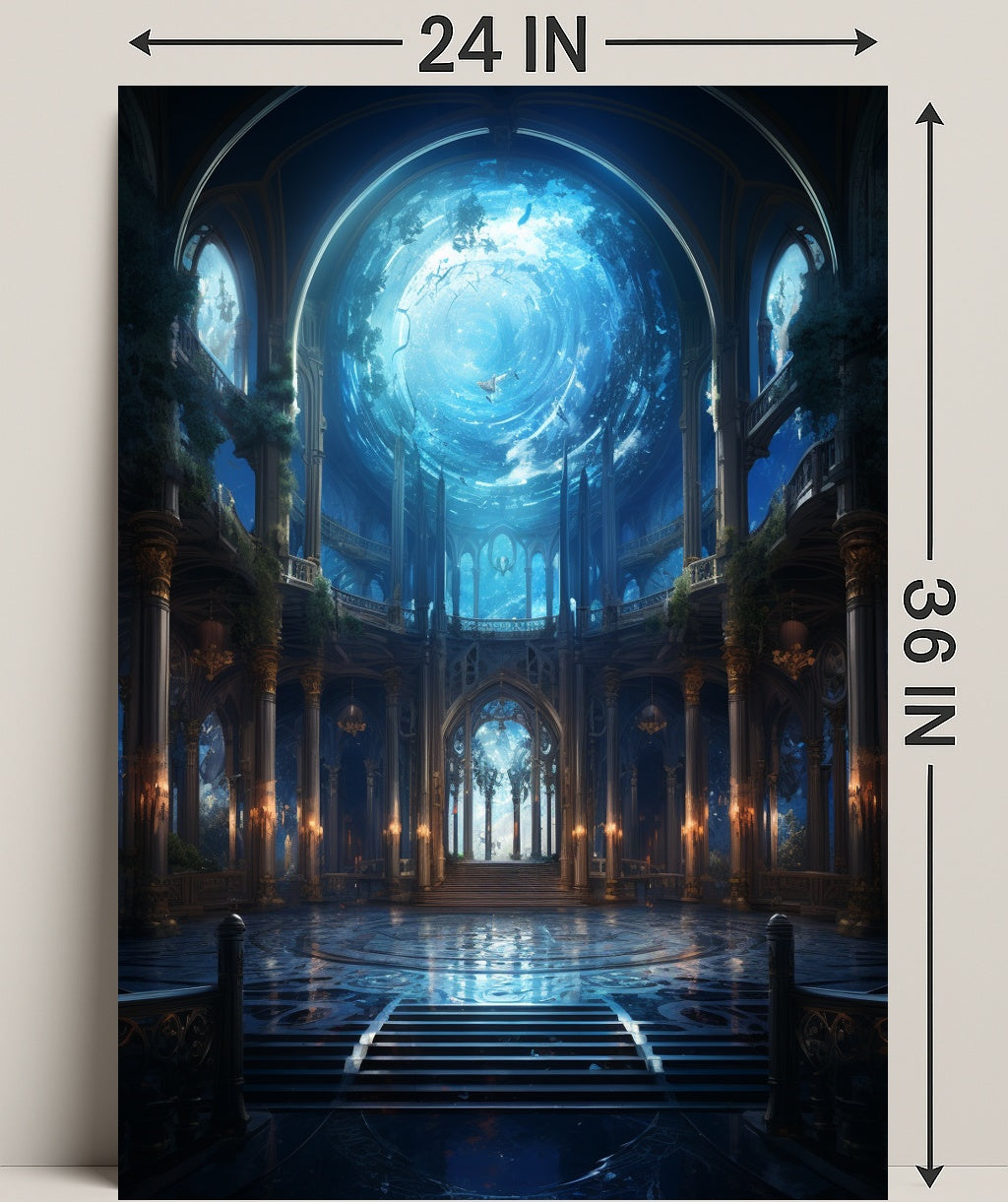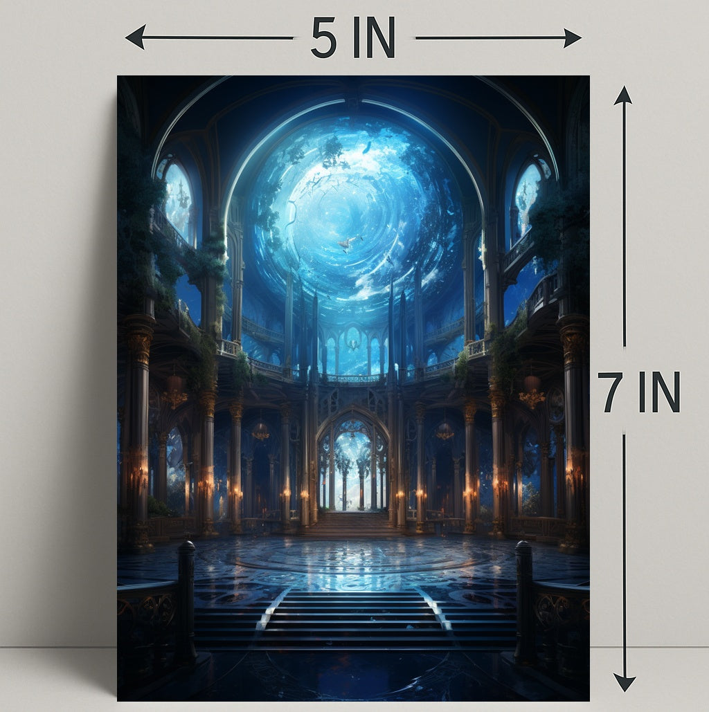 Printed with vivid, fade-resistant inks on high-quality stock to preserve the deep blues, warm golden accents, and intricate architectural lines. The Enchanted Aquatic Hall Poster makes a memorable gift or striking souvenir for anyone drawn to surreal, aquatic-inspired art.