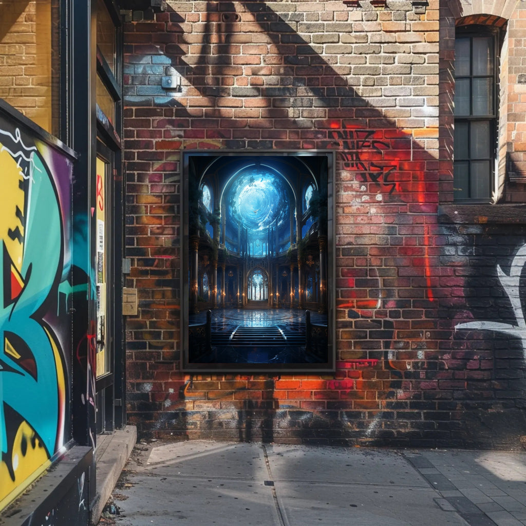 Immerse your home in a dreamlike panorama with the Enchanted Aquatic Hall Poster by PosterGoat — a striking art print that blends cathedral-scale architecture with an otherworldly oceanic sky. This poster captures a vast vaulted hall framed by ornate columns and golden chandeliers, a polished reflective floor that mirrors a swirling, luminous aquatic vortex above. The result is a scenic, minimalist composition that brings depth, serenity, and cinematic atmosphere to any room.