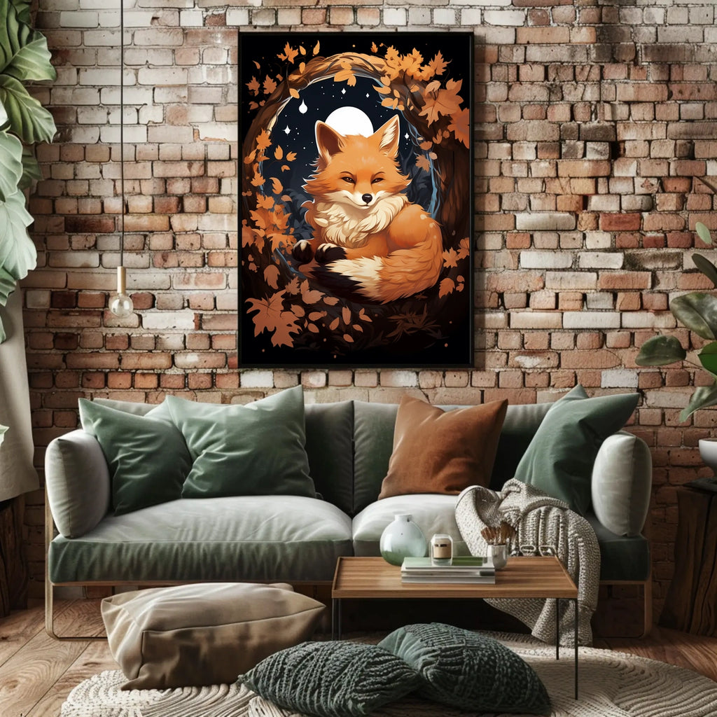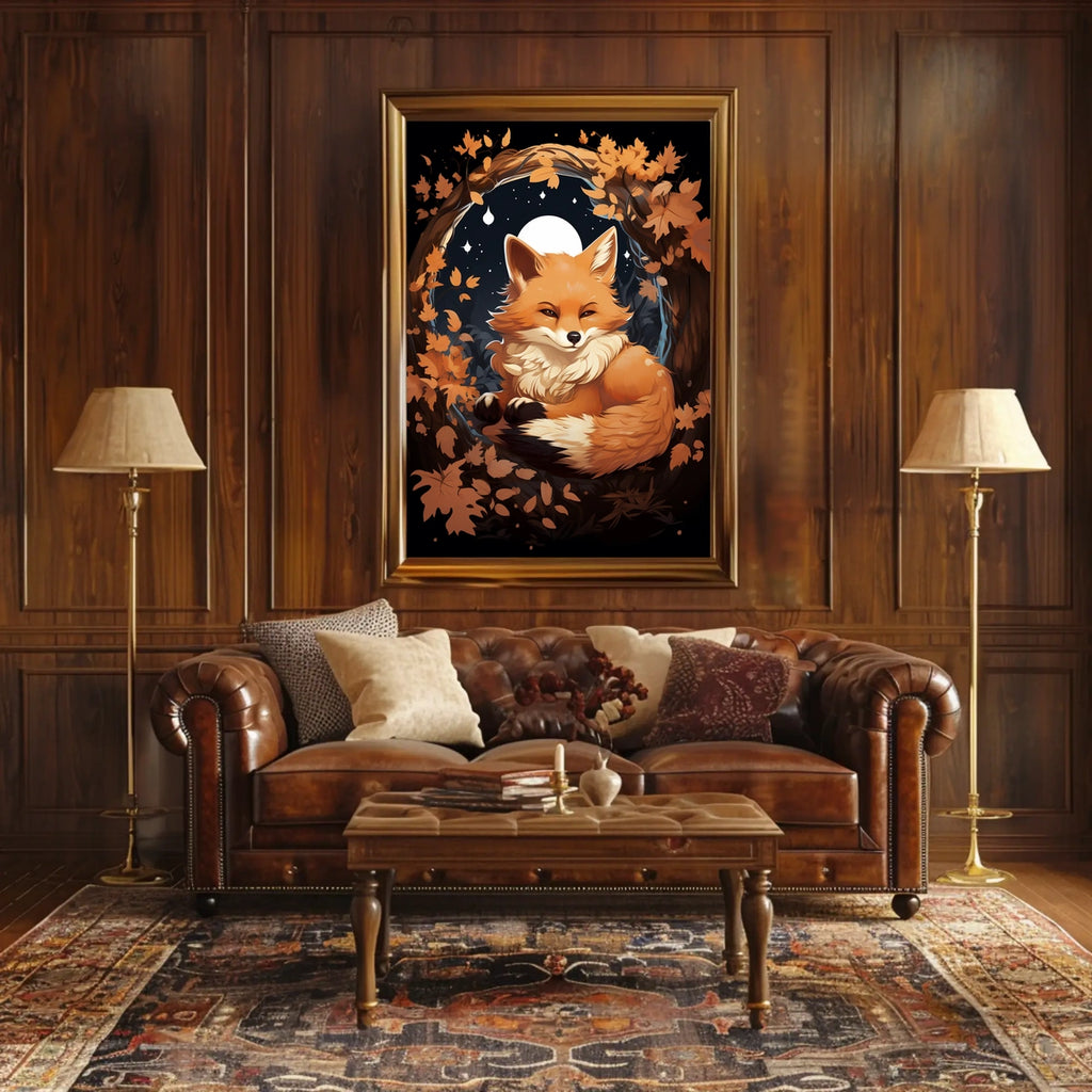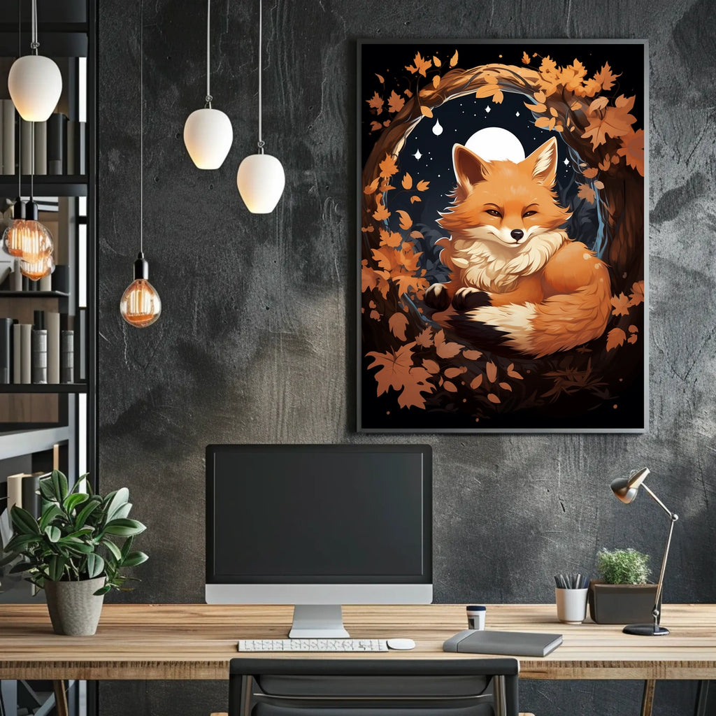 Immerse yourself in the magic of the season with Enchanted Autumn Night, a captivating illustration that blends serenity with wonder. This artwork portrays a serene fox nestled within a wreath of autumn leaves beneath a luminous full moon, evoking the tranquil beauty and mystique of an enchanted forest night. Perfect for nature lovers and anyone seeking warm, nature-inspired decor.