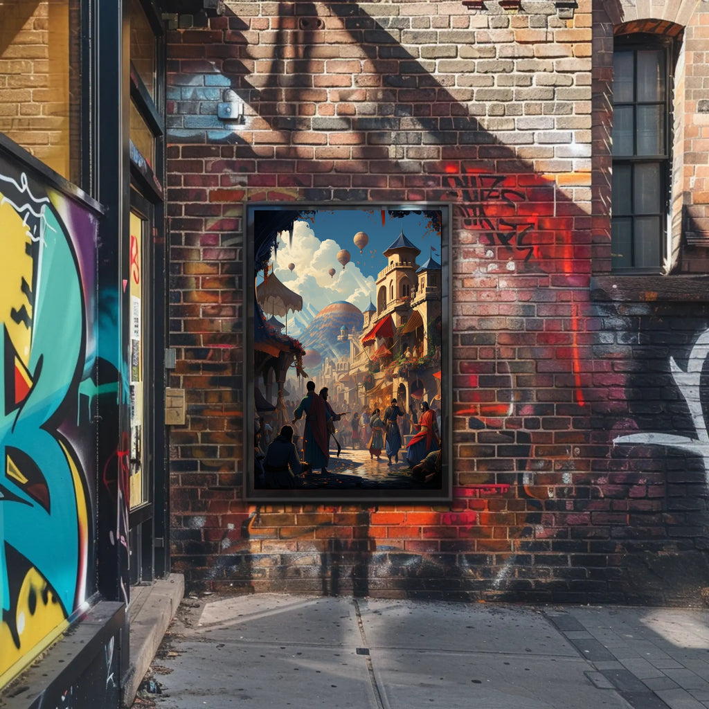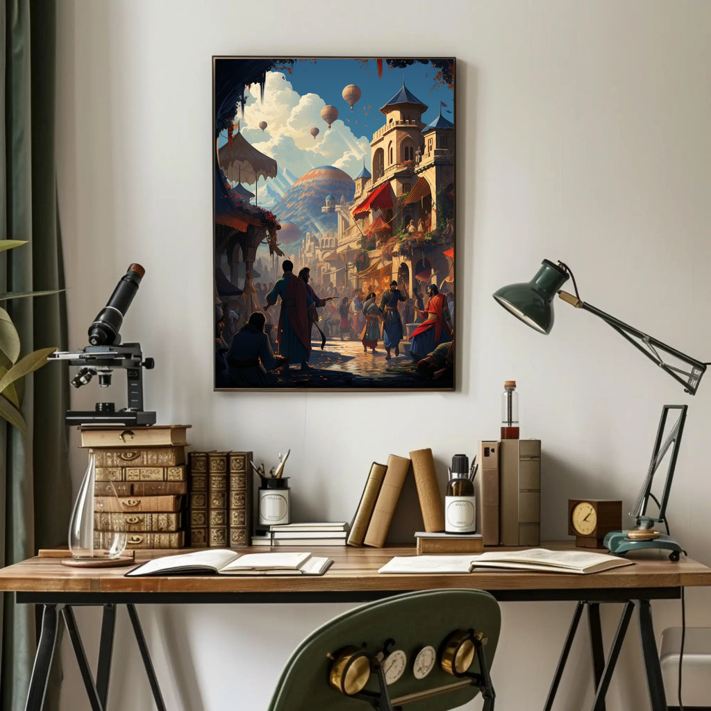 Enchanted Bazaar Poster from PosterGoat brings a sunlit, storybook marketplace to your wall — a richly detailed poster that captures a bustling bazaar, ornate towers, flowing awnings, and hot air balloons drifting across a crystal-blue sky.