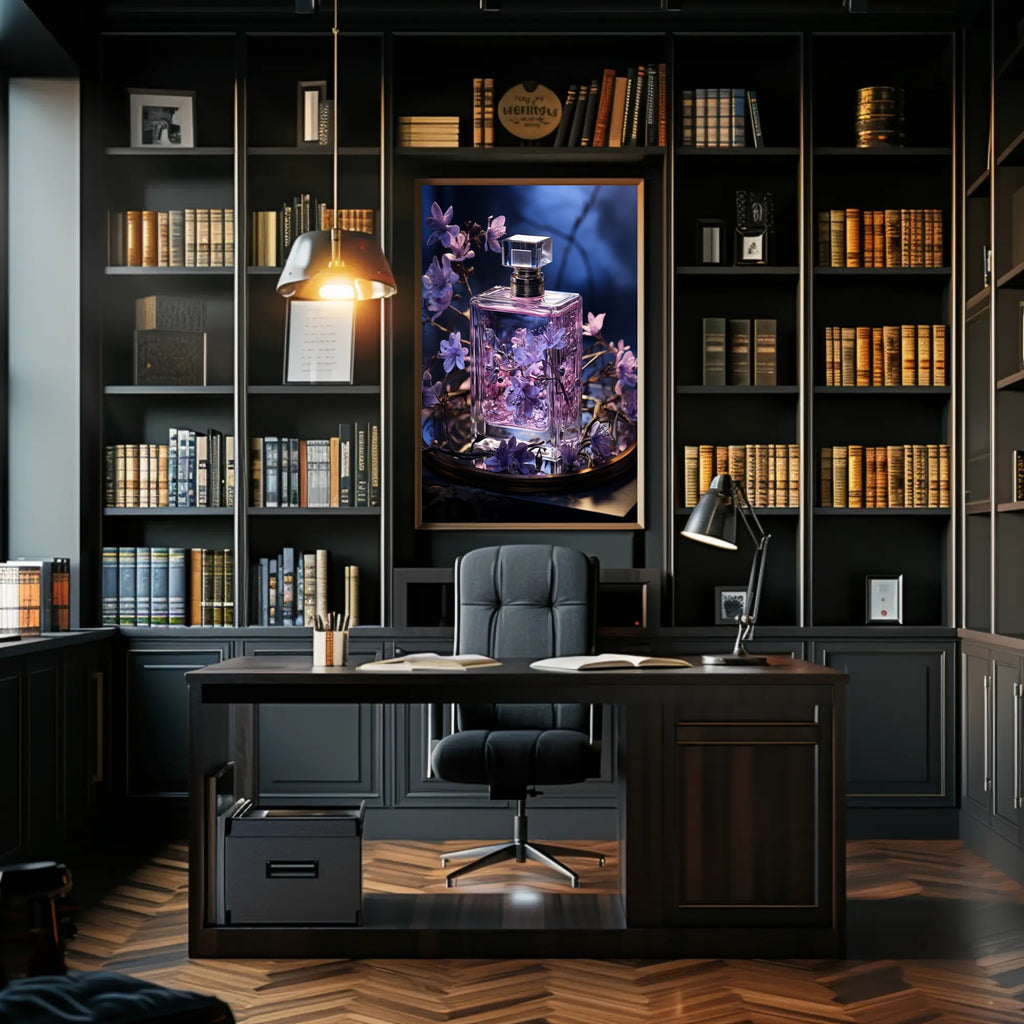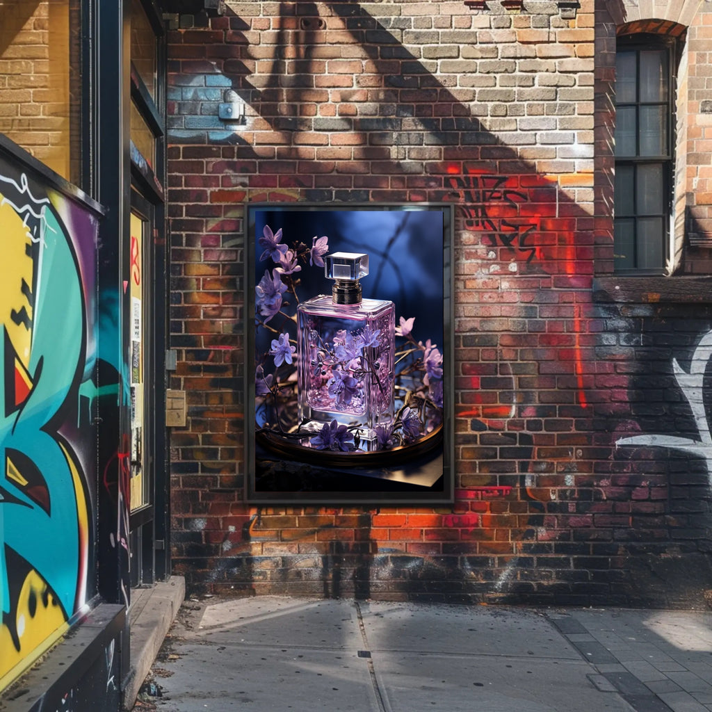 Enchanted Blossom Essence Poster by PosterGoat captures a moment of floral wonder — a crystal-clear perfume bottle cradling delicate purple blossoms, set against a dreamy blue backdrop. This artful poster brings a romantic, minimalist aesthetic to any room and makes a refined statement for home décor lovers and collectors of scenic wall art.