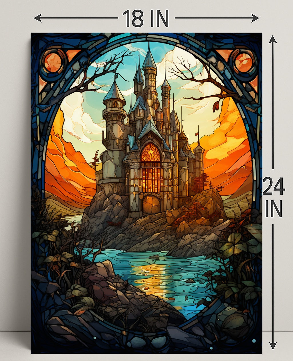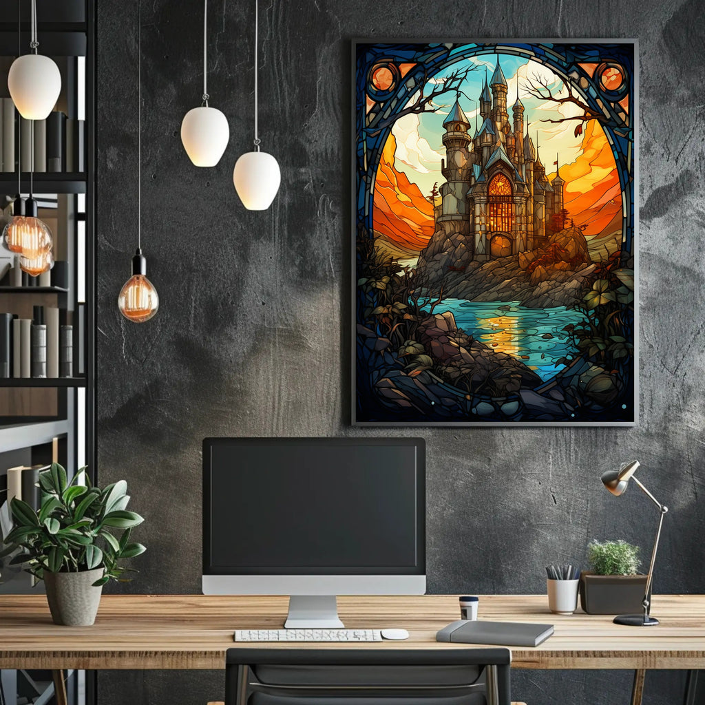 Bring a touch of fairytale wonder to your walls with the Enchanted Castle At Sunset Poster from PosterGoat — a stunning, vintage-collage inspired art print that captures a majestic castle bathed in warm sunset light, framed like an intricate stained-glass window.