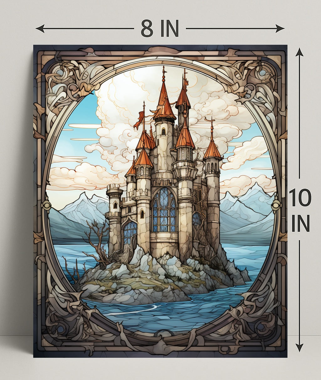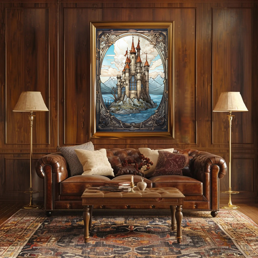Bring a storybook vista into your home with the Enchanted Castle By The Sea Poster from PosterGoat. This highly detailed art print depicts a majestic stone castle with red-tile turrets perched on a rocky islet, framed by an ornate, stained-glass style border and set against rolling sea and distant mountains — a scenic centerpiece that transforms any wall into a window to another world.