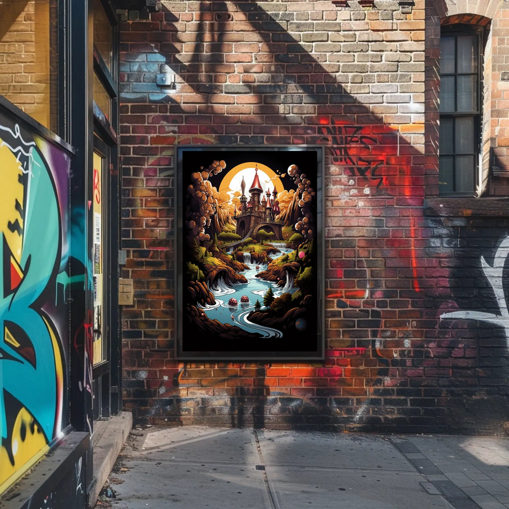 Immerse yourself in a whimsical realm where a grand castle perched on a rocky outcrop meets lush greenery, rounded trees, and a flowing river with cascading waterfalls. Bold outlines and vibrant colors create a modern fantasy comic ambiance, while surreal elements like oversized mushrooms and polka-dotted orbs enhance the enchanting mood. This fantasy landscape poster is ideal for fans of adventure, fairy tales, and magical realms.