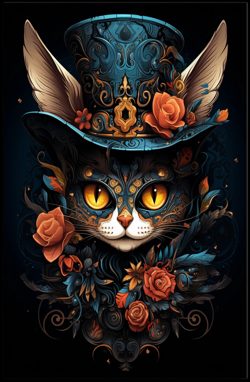 Immerse yourself in a world of fantasy with this mesmerizing poster, featuring a cat adorned with an elaborate top hat. The cat's expressive face, with its striking golden eyes, is beautifully highlighted against the intricate patterns on its fur. The top hat, richly decorated with swirling blue and gold designs and accented with orange roses and feathers, adds an elegant and whimsical touch. The detailed artistry blends elements of fantasy and surrealism, creating a mysterious and enchanting mood that enhances any room.