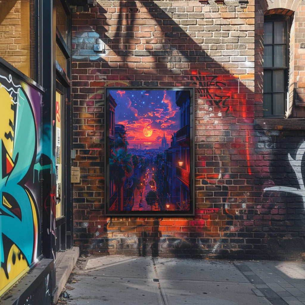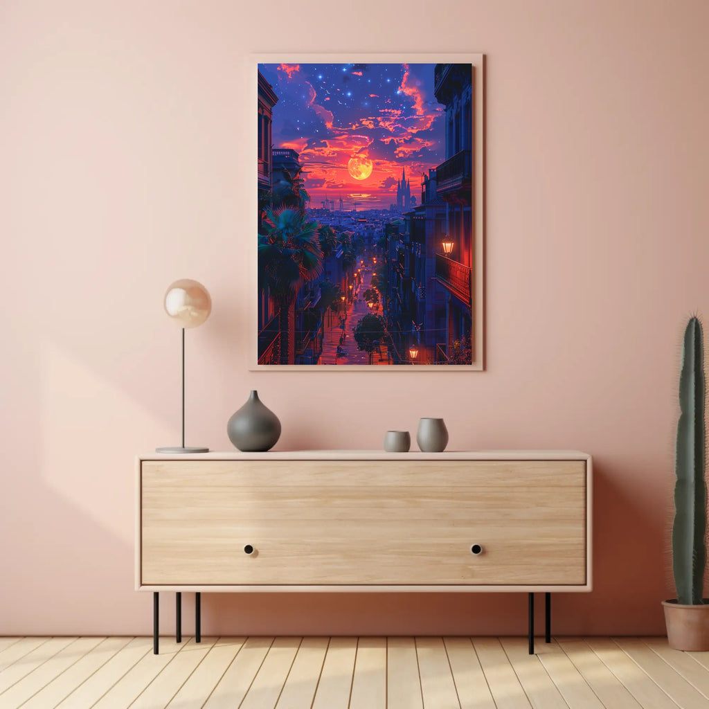 Bring the magic of a twilight cityscape into your home with the Enchanted Evening in the City Art Poster Print by PosterGoat — a striking wall art piece that blends vibrant sunset hues, glowing moonlight, and intimate urban detail into one captivating scene.
