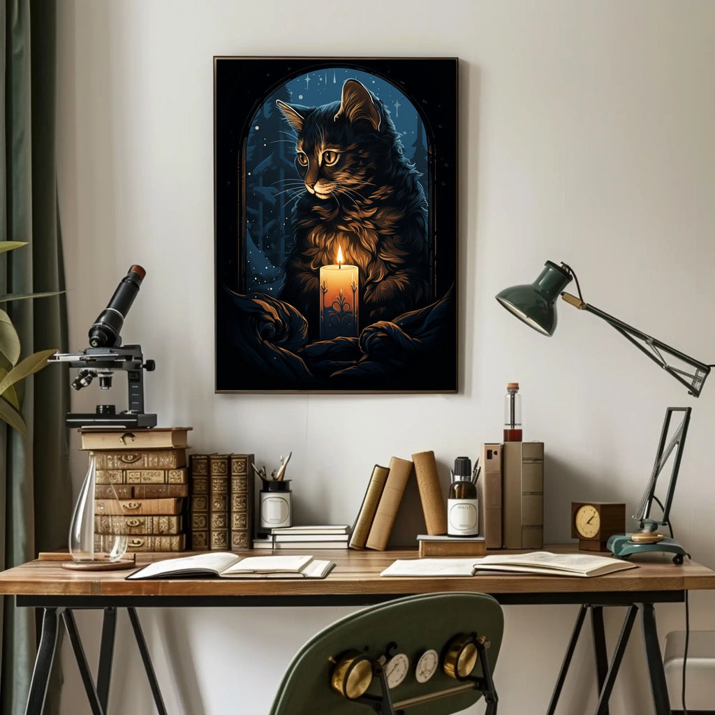 - Detailed design highlighting the serene cat amid an enchanted evening scene