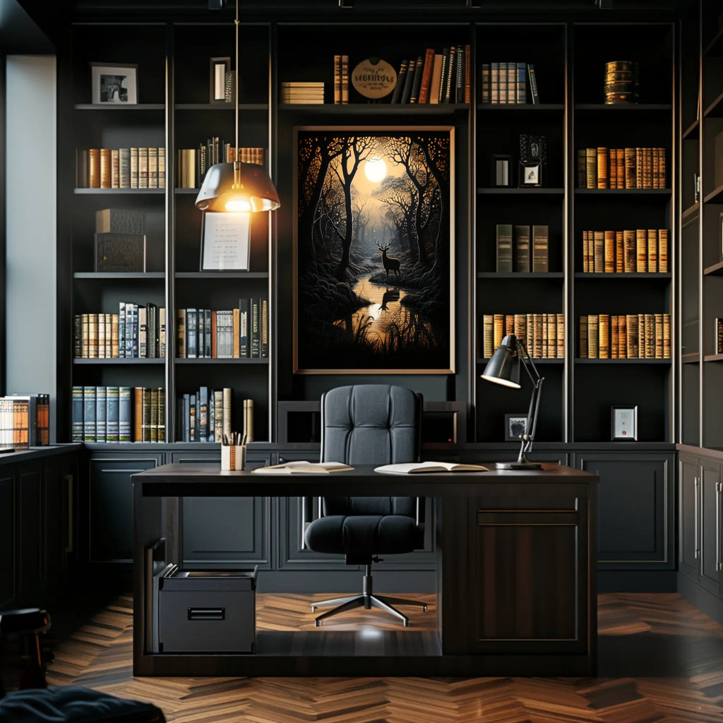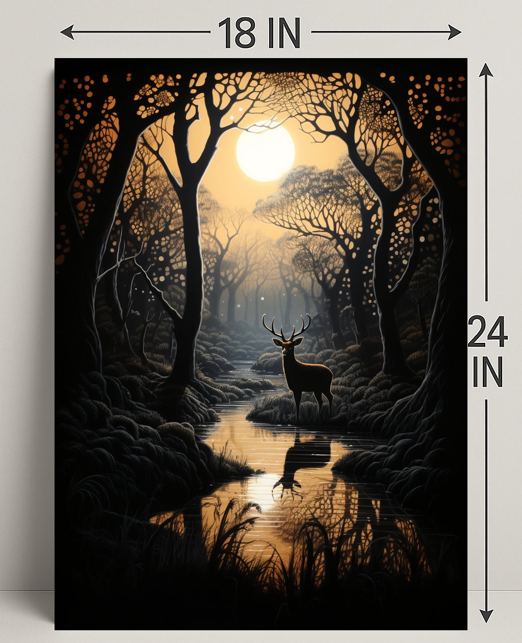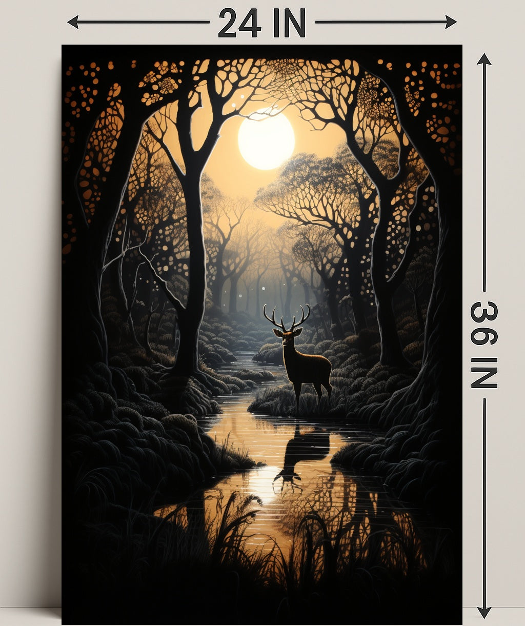 Invite twilight magic into your home with the Enchanted Forest At Dusk Poster from PosterGoat. This minimalist, artful print captures a moonlit woodland scene—towering, lace-like tree canopies arch over a quiet stream as a lone stag stands in graceful silhouette, its reflection glowing in warm, golden dusk. The composition blends serene atmosphere with intricate detail to create a striking focal point for living rooms, bedrooms, offices, or entryways.