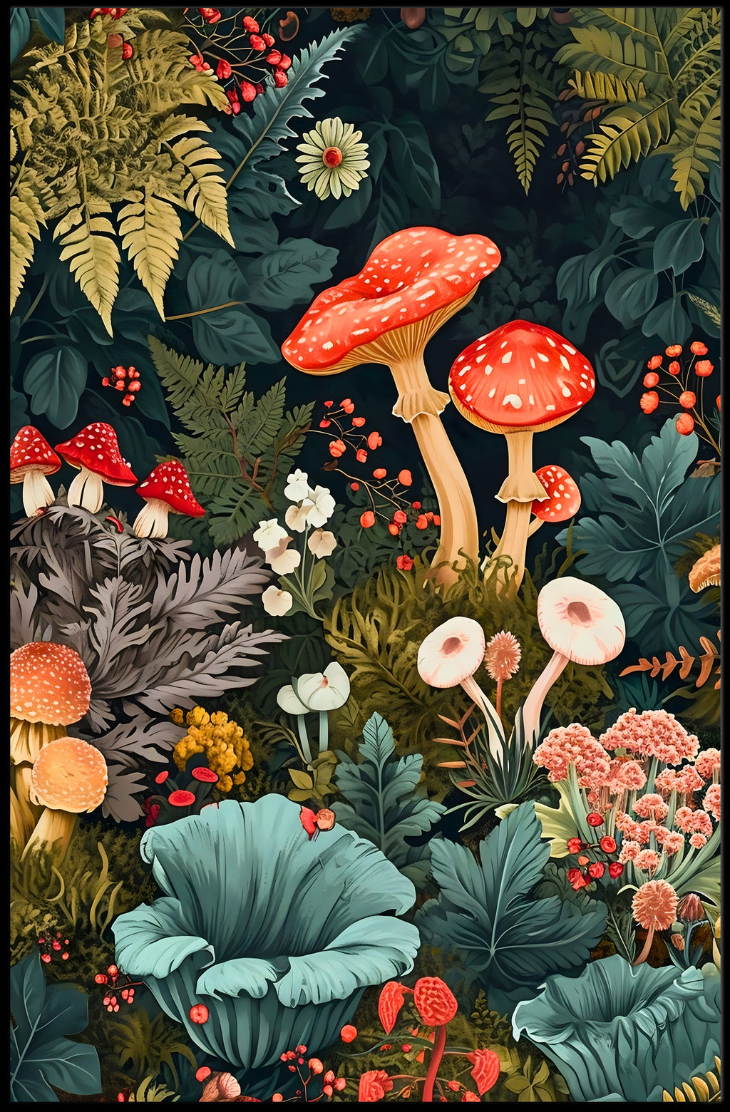Enchanted Forest Flora William Morris Art Poster — an evocative botanical print from PosterGoat that brings the lush mystery of woodland flora into your home. This richly detailed poster pairs classic William Morris-inspired ornamentation with contemporary color — deep teal foliage, coral-red toadstools, and soft pastel blooms — for a striking focal point in any room.