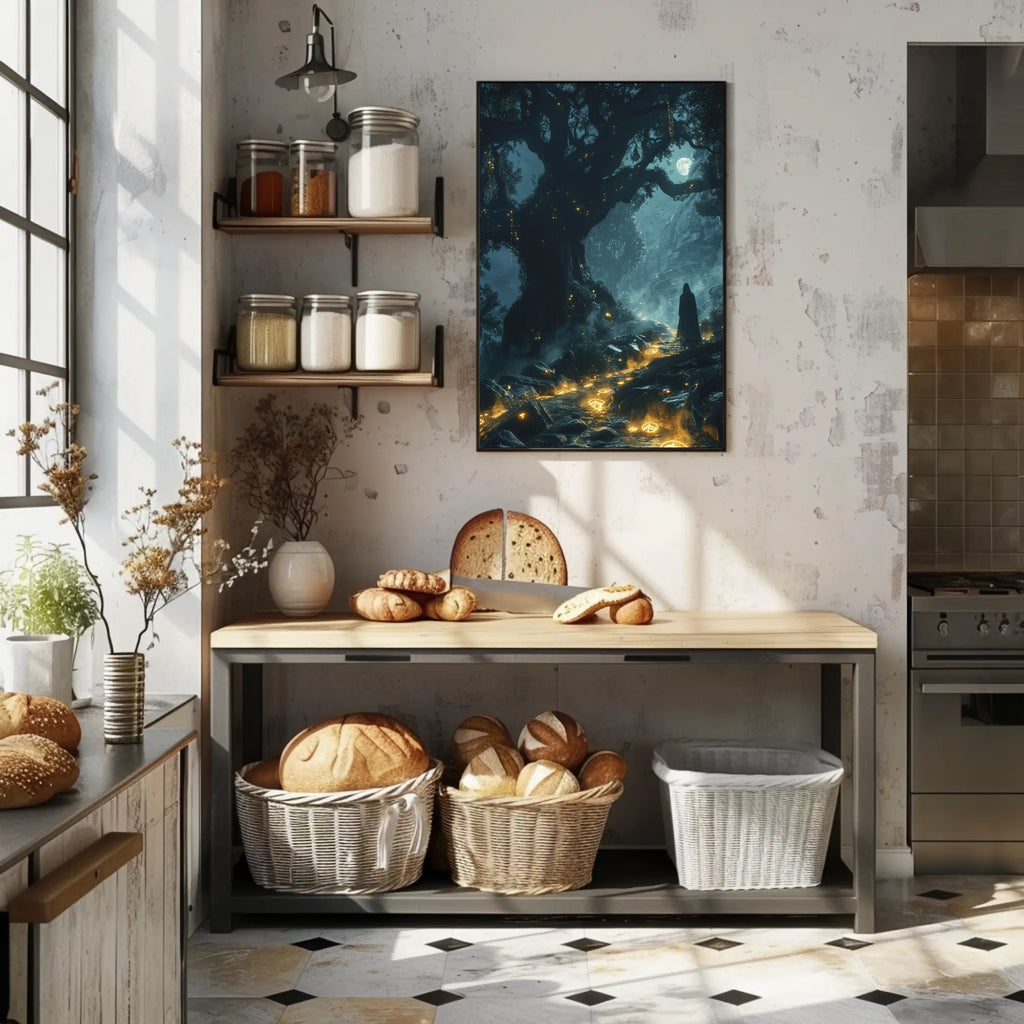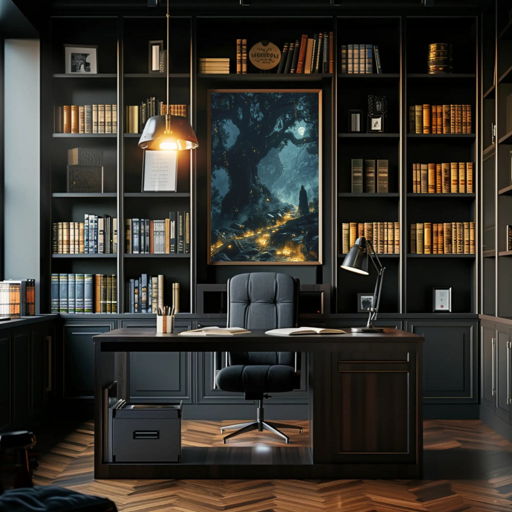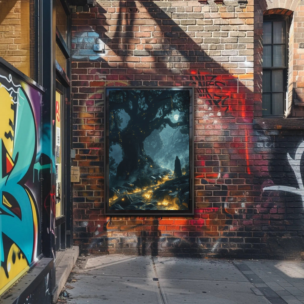 Invite mystery and wonder into your home with the Enchanted Forest Pathway Wall Art Poster Print by PosterGoat. This atmospheric poster captures a moonlit woodland scene: a towering, ancient tree silhouetted against a misty blue night, a cloaked figure standing on a rocky trail, and a glowing pathway of golden runes and ember-like lights that guide the eye through the composition. Rich contrast and cinematic depth make this print a focal point for any room.