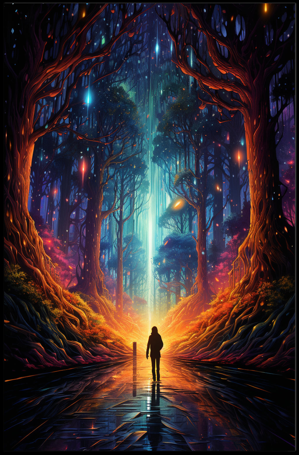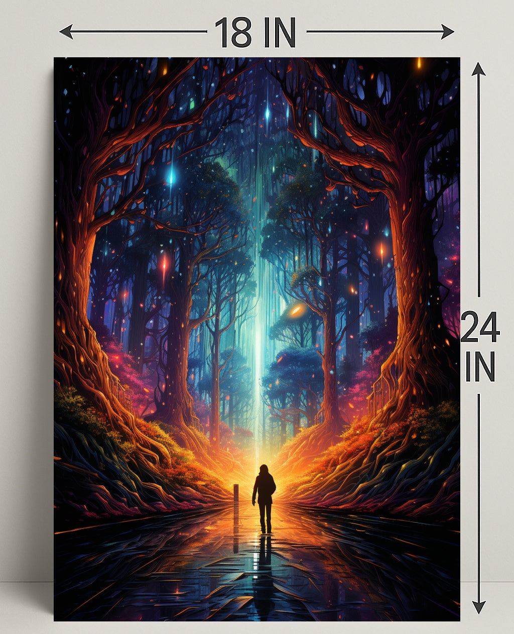 Step into a world of wonder with the Enchanted Forest Pathway Poster from PosterGoat — a mesmerizing wall art print that transforms any space into a doorway to magic. Rich, cinematic colors and luminous highlights draw the eye down a reflective pathway framed by towering, intricate trees, while a solitary silhouette invites imagination and adventure.