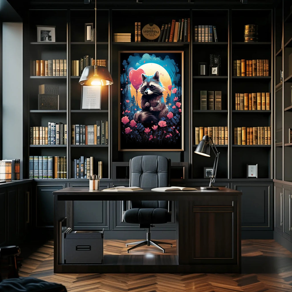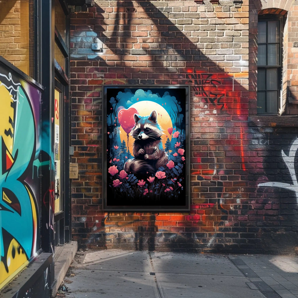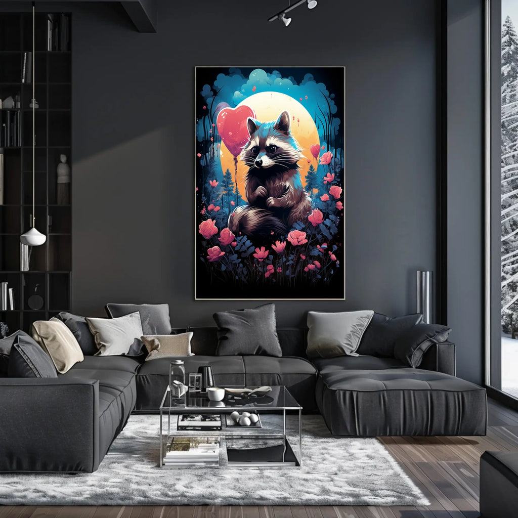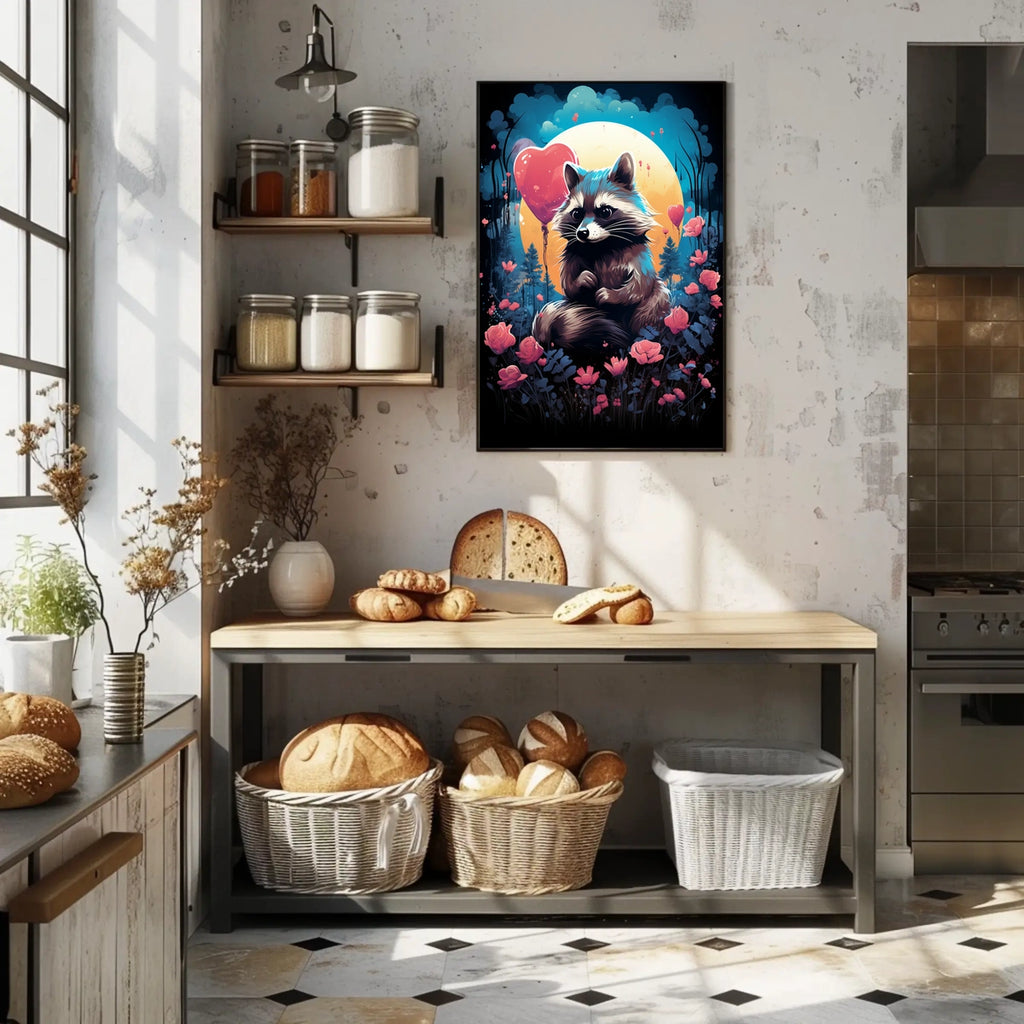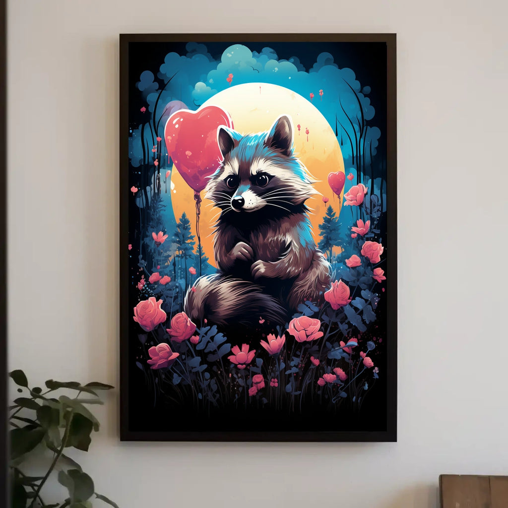 Immerse yourself in a whimsical realm where nature meets magic with the Enchanted Forest Romance Poster. This enchanting wall art blends woodland charm with romantic whimsy, featuring a curious raccoon nestled among pink roses and a heart-shaped balloon against a dreamy forest backdrop. It appeals to nature lovers and fans of magical decor, turning any wall into a storyteller's space full of warmth and wonder.