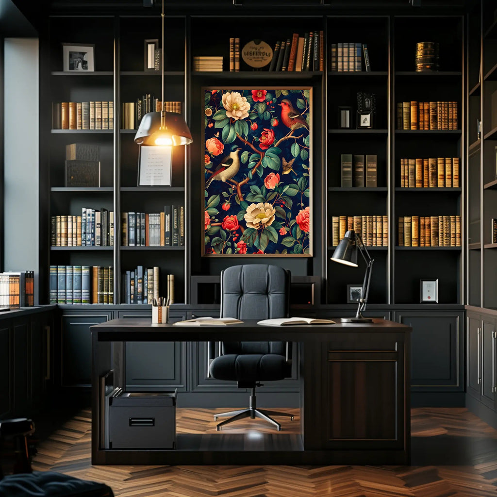 Invite a touch of whimsy and botanical elegance into your home with the Enchanted Garden Birds Wall Art Print from PosterGoat. This richly detailed poster showcases vibrant songbirds perched among lush foliage, blooming roses and creamy peonies against a deep navy background—creating a dramatic focal point that complements minimalist and contemporary interiors.