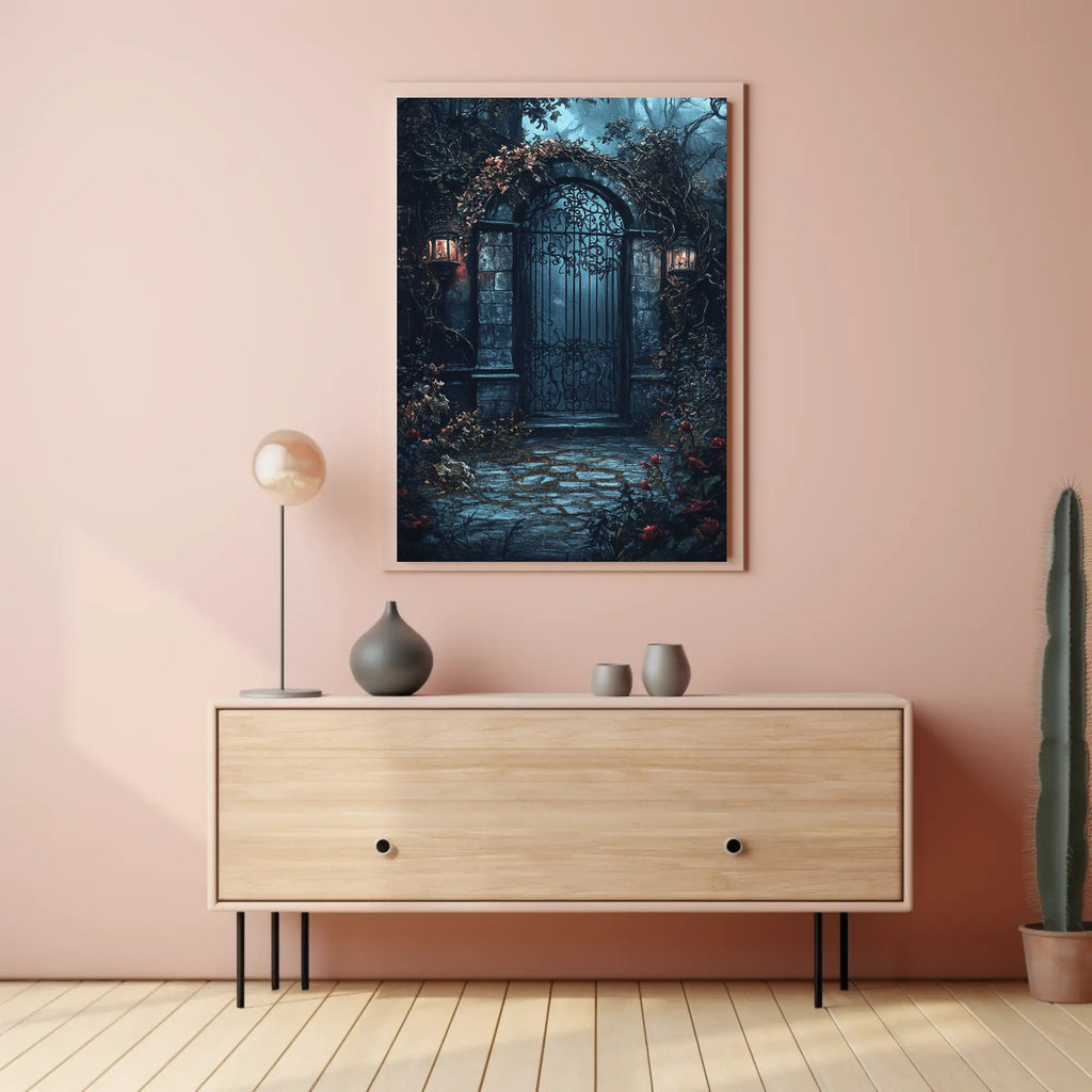 Invite mystery and timeless beauty into your space with the Enchanted Garden Gate Poster from PosterGoat. This moody, artful print captures an ornate wrought-iron gate framed by weathered stone, lantern glow, climbing vines and rich rose blooms—perfect for decor lovers, minimalists, and anyone drawn to scenic, atmospheric wall art.