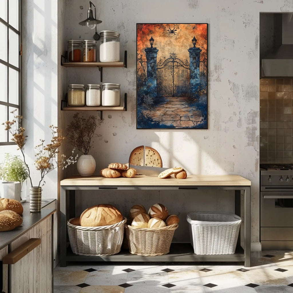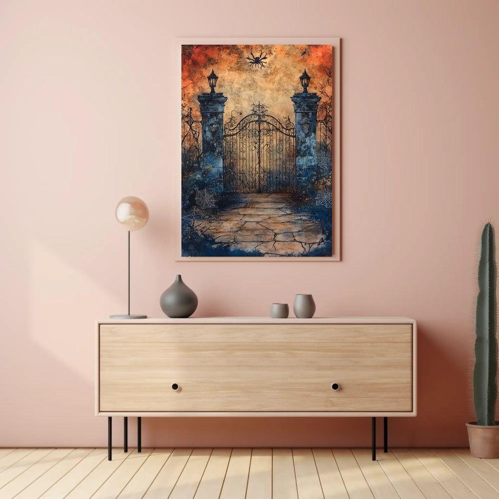 Invite a touch of mystery and twilight charm into your home with the Enchanted Gate At Dusk Poster from PosterGoat. This evocative wall art captures an ornate wrought-iron gate framed by weathered stone pillars, creeping vines and delicate spiderwebs—rendered in a dramatic dusk palette of glowing amber and deep indigo that transforms any room into a moody, cinematic scene.