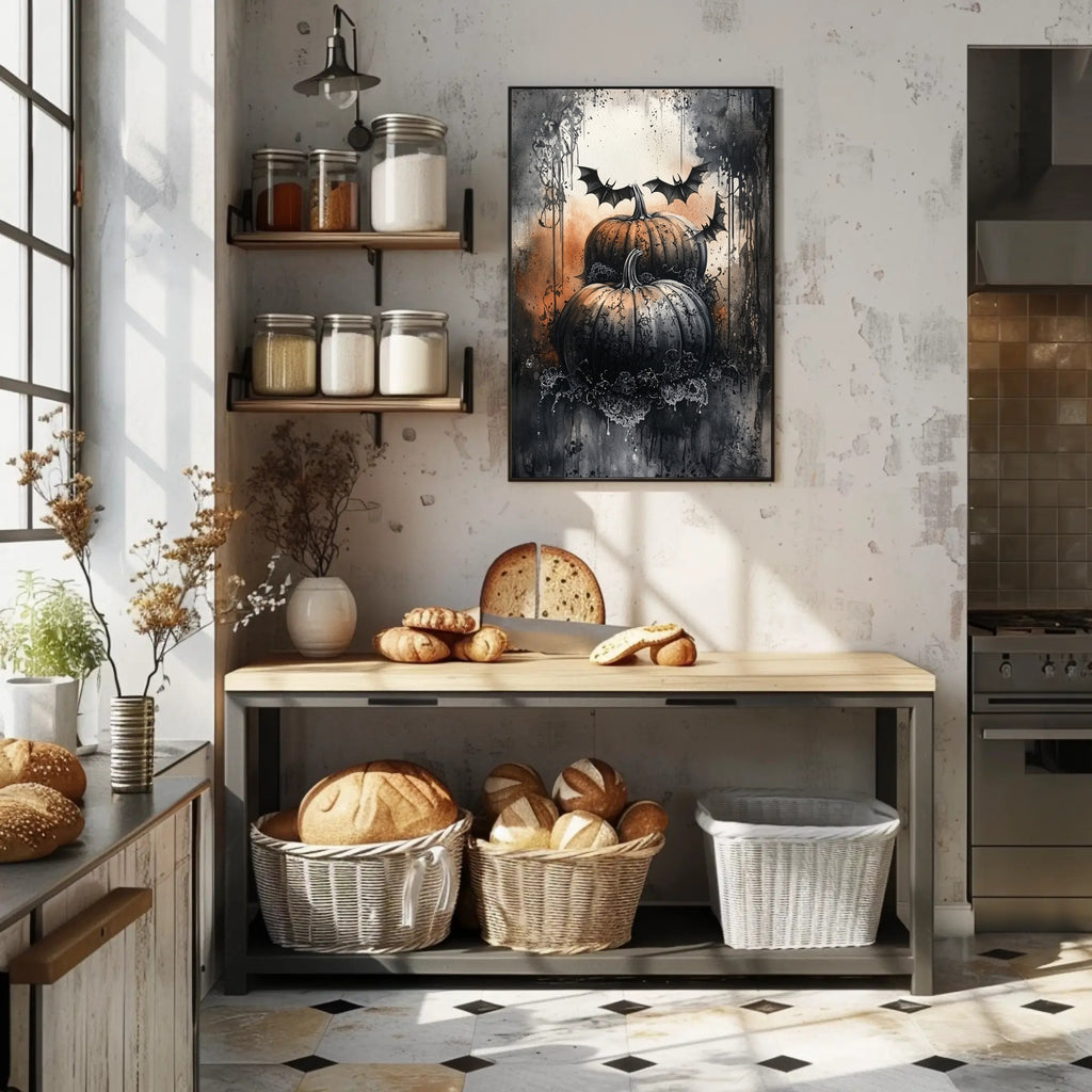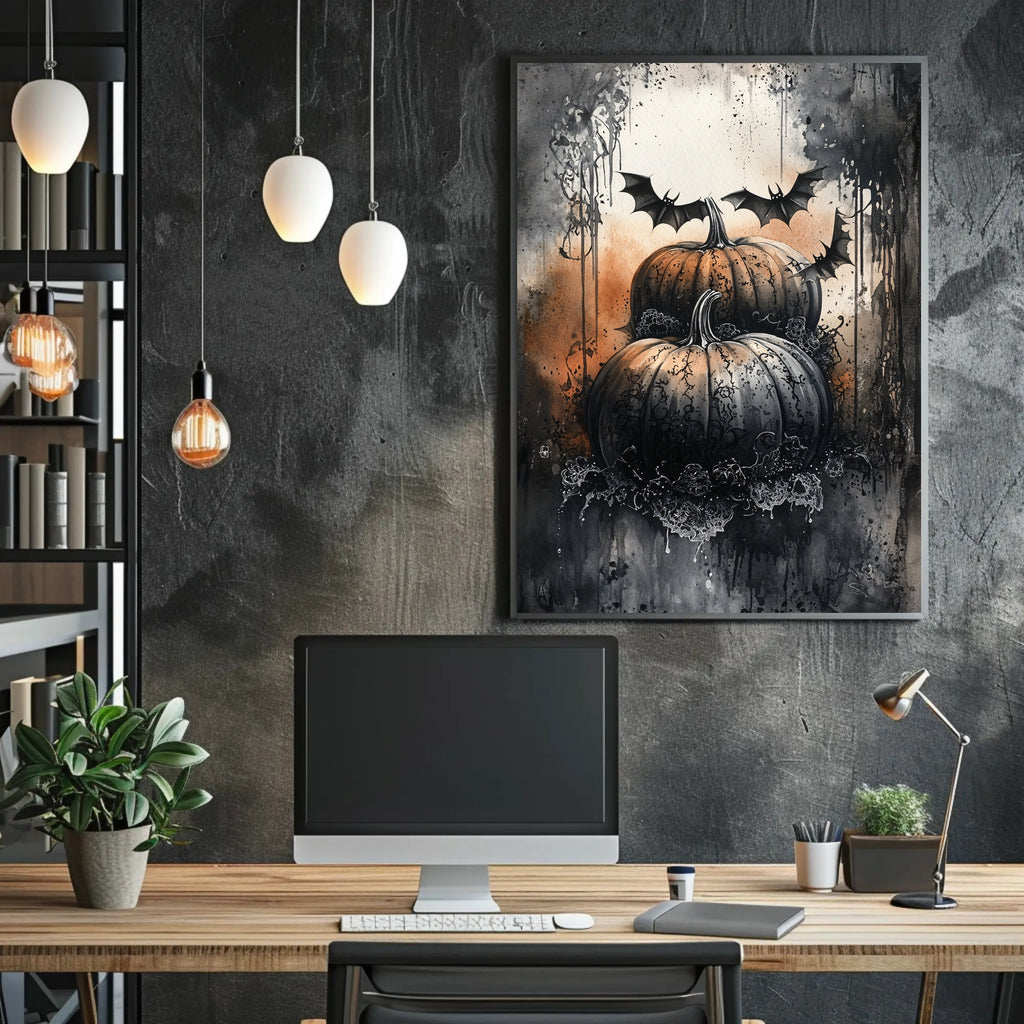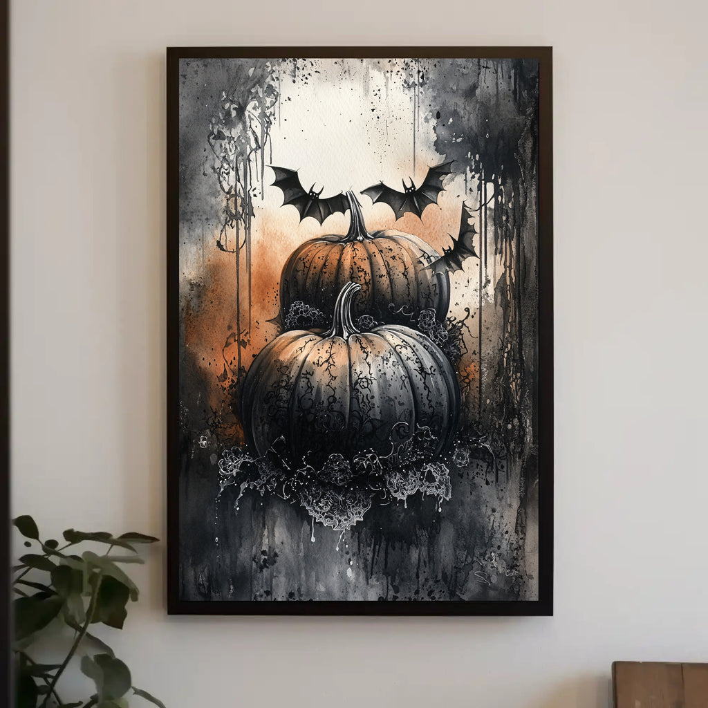 Bring a spellbinding autumn evening to your walls. The Enchanted Halloween Night Poster from PosterGoat captures a moody, vintage-collage aesthetic with two stacked pumpkins, fluttering bats, and dramatic watercolor drips — a hauntingly beautiful piece of wall art that elevates any Halloween display or year-round seasonal decor.