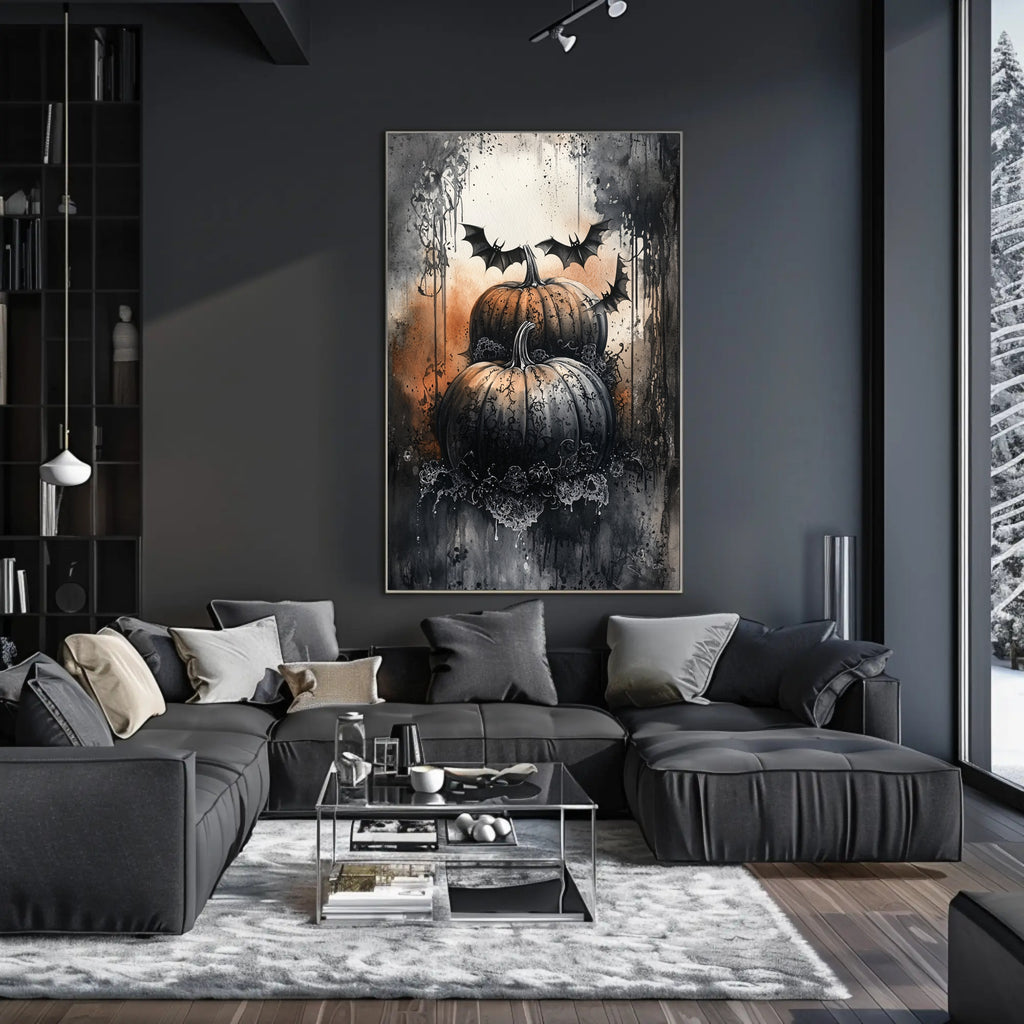 Striking visual impact: Large, layered pumpkins and silhouetted bats create an immediate focal point for living rooms, entryways, or seasonal displays.