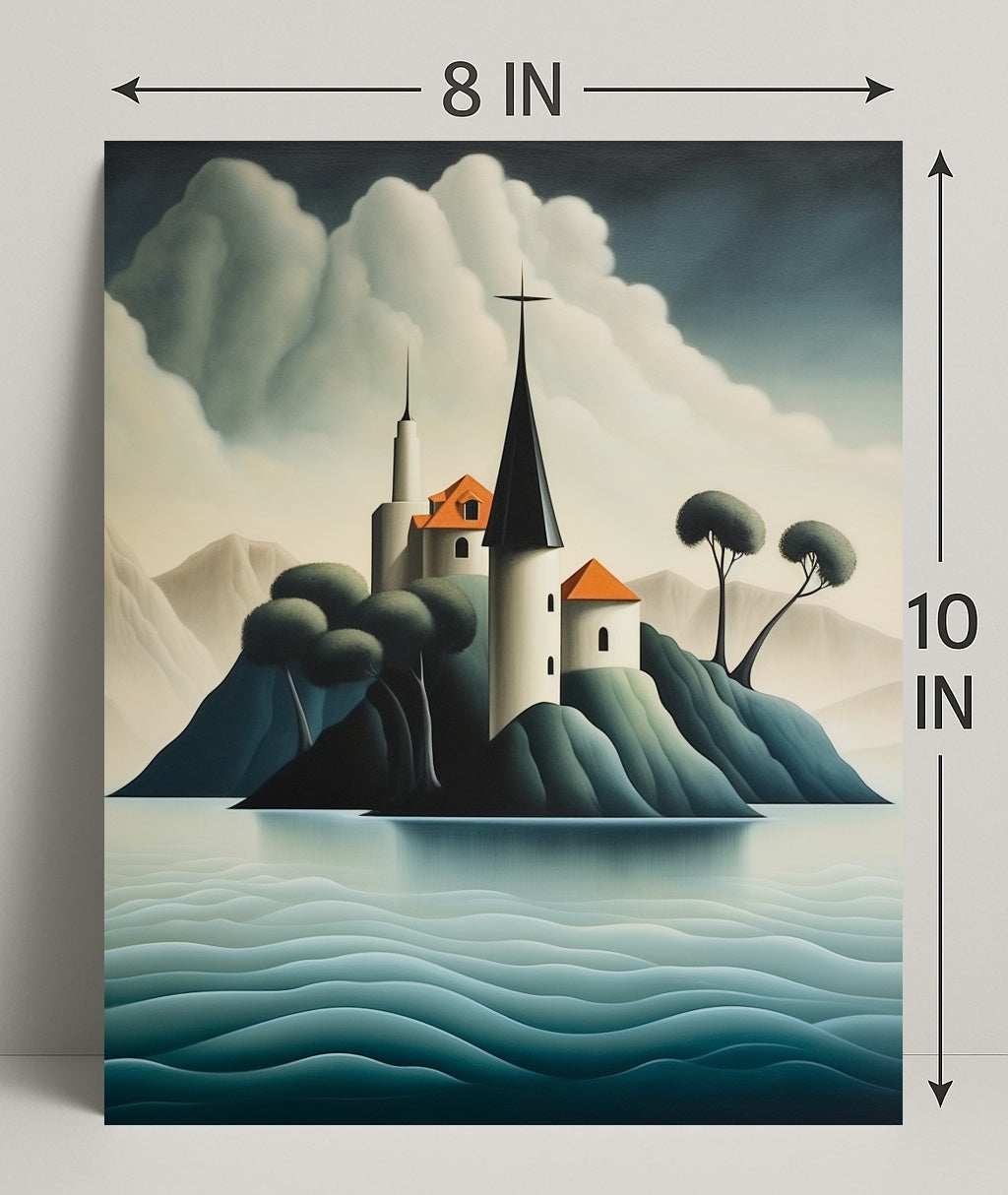 Bring a touch of mystery and minimalist charm to your walls with the Enchanted Island Fortress Poster from PosterGoat. This scenic poster depicts a serene island stronghold — tall, elegant spires, warm terracotta rooftops, sculpted trees and layered teal waves — rendered in a soft, dreamlike palette that suits contemporary and classic interiors alike.