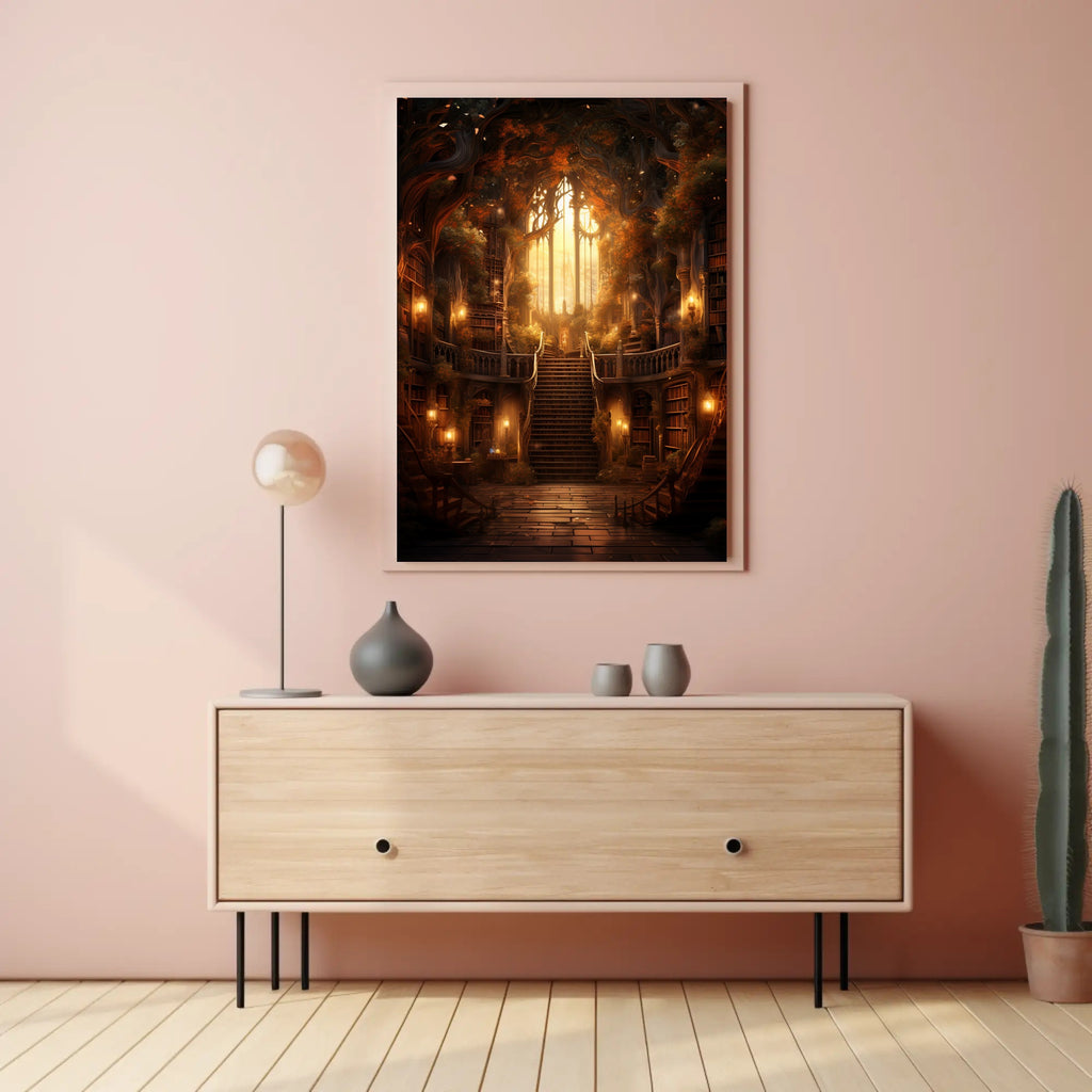 Transform any room into a storybook sanctuary with the Enchanted Library Poster from PosterGoat. Bathed in warm golden light, this art print draws the eye up a grand central staircase toward an ornate, cathedral-style window framed by living, tree-like columns and shelves overflowing with books — a perfect blend of fantasy and minimalist elegance that anchors your decor.