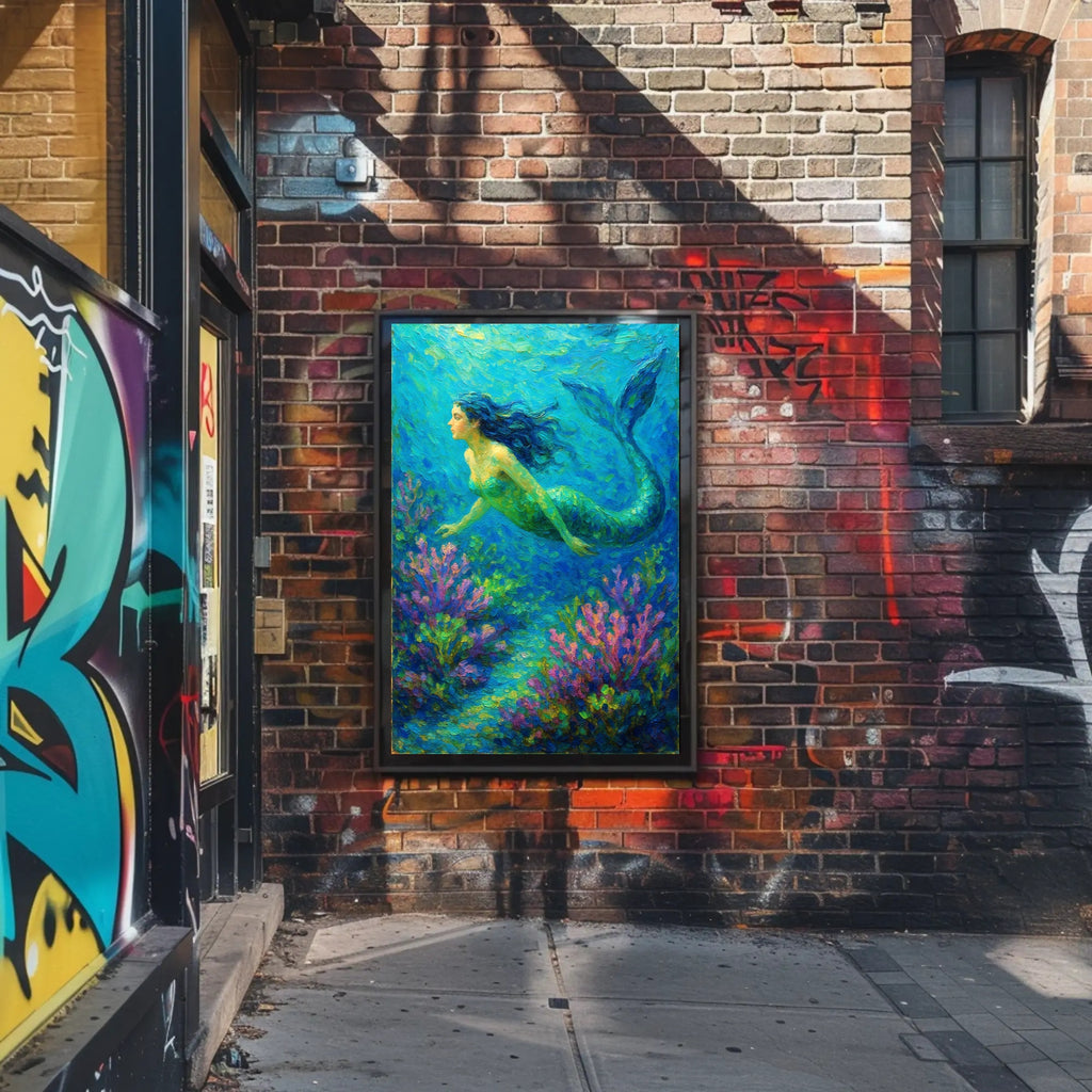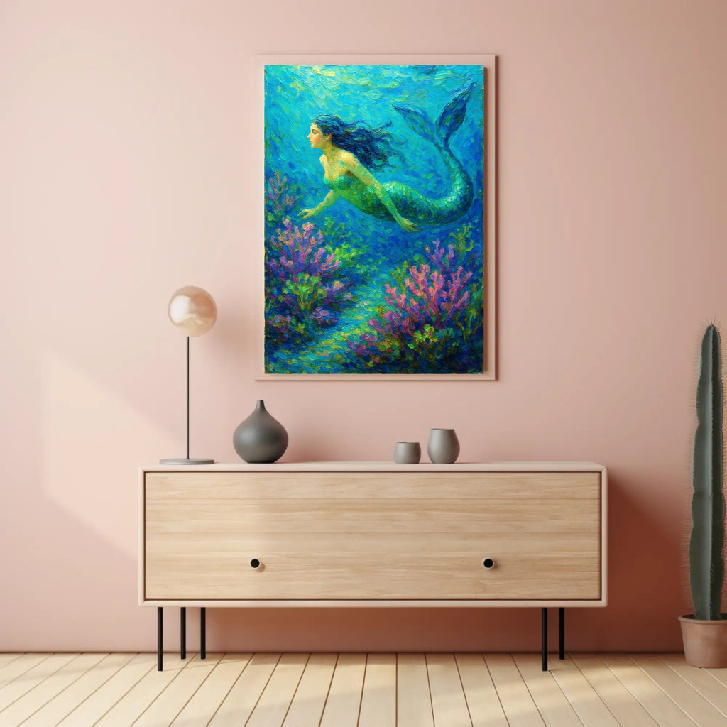 Immerse any room in oceanic wonder with the Enchanted Mermaid Under the Sea Poster from PosterGoat — an artful, textured print that transforms walls into a shimmering underwater escape. Rich teal and sapphire tones, luminous highlights, and expressive brushstroke details recreate the feeling of sunlight filtering through water as a graceful mermaid glides above colorful coral beds.