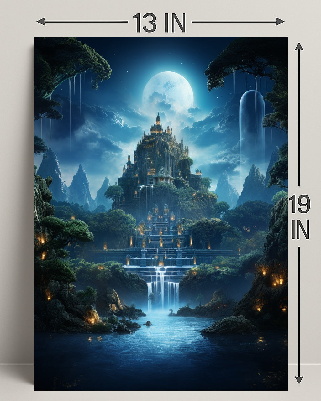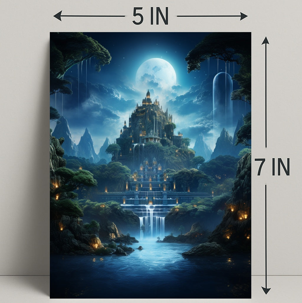 Invite mystery and wonder into your home with the Enchanted Moonlit Castle Poster from PosterGoat — a photorealistic poster that captures a luminous full moon, cascading waterfalls, and a towering, terraced castle nestled in misty, forested cliffs. This striking wall art blends scenic fantasy with fine-detail realism to transform any room into a storybook retreat.