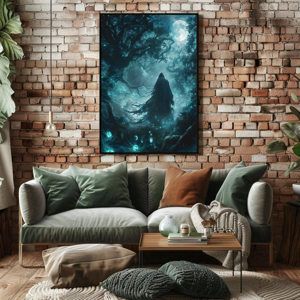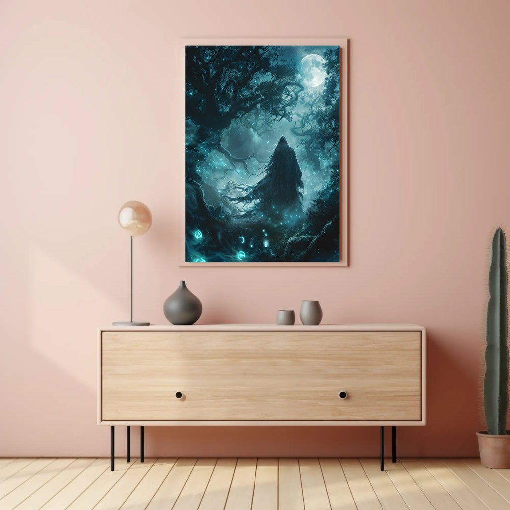 Invite mystery into your home with the Enchanted Nocturne Art Poster by PosterGoat — a photorealism-inspired print that blends moonlit fantasy and nature-driven atmosphere. A solitary, hooded figure drifts beneath twisted, ancient trees while a luminous full moon and swirling teal motes cast an otherworldly glow across the scene, creating a captivating focal point for any room.
