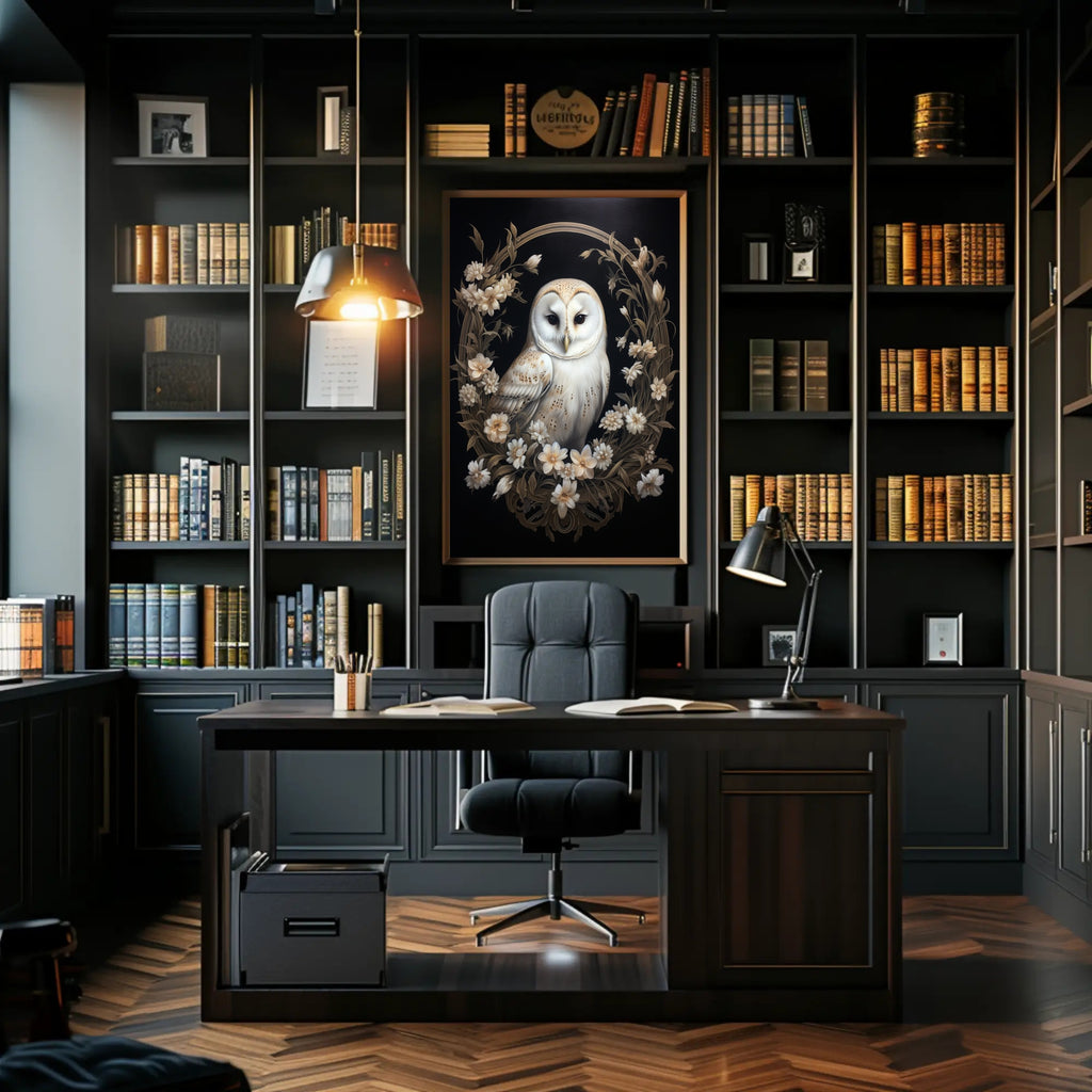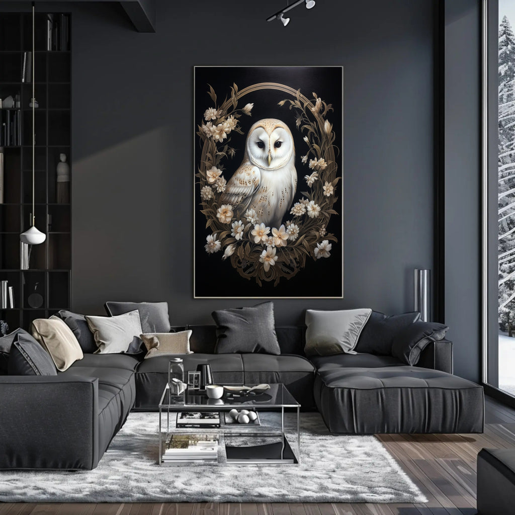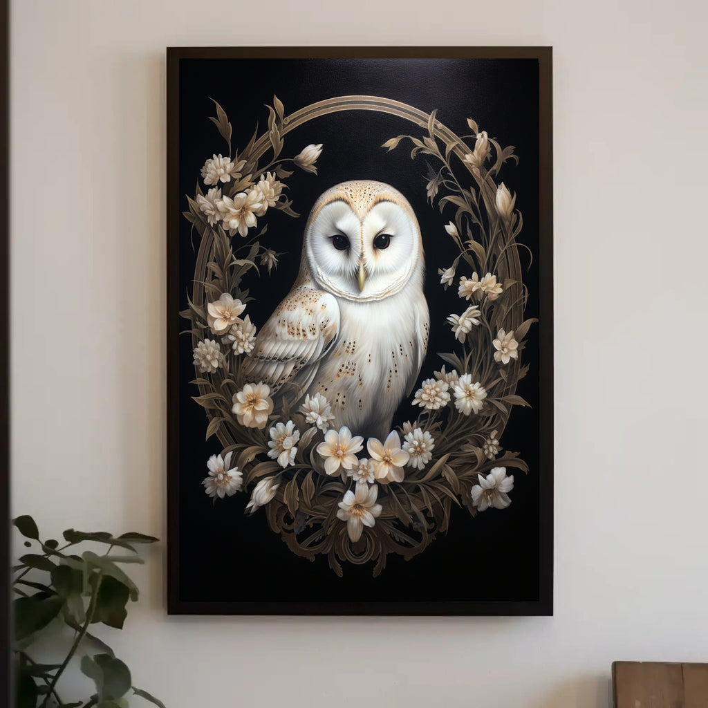 Why it stands out: The poster’s high-contrast composition and muted, neutral palette create an elegant focal point that complements minimalist and classic interiors alike. The owl’s soft, lifelike plumage and the wreath’s intricate botanical details invite a closer look, adding depth and charm to living rooms, bedrooms, nurseries, or office spaces.