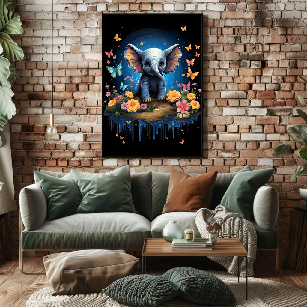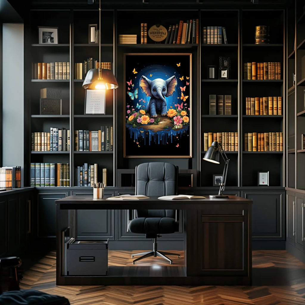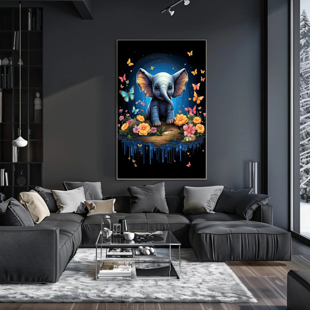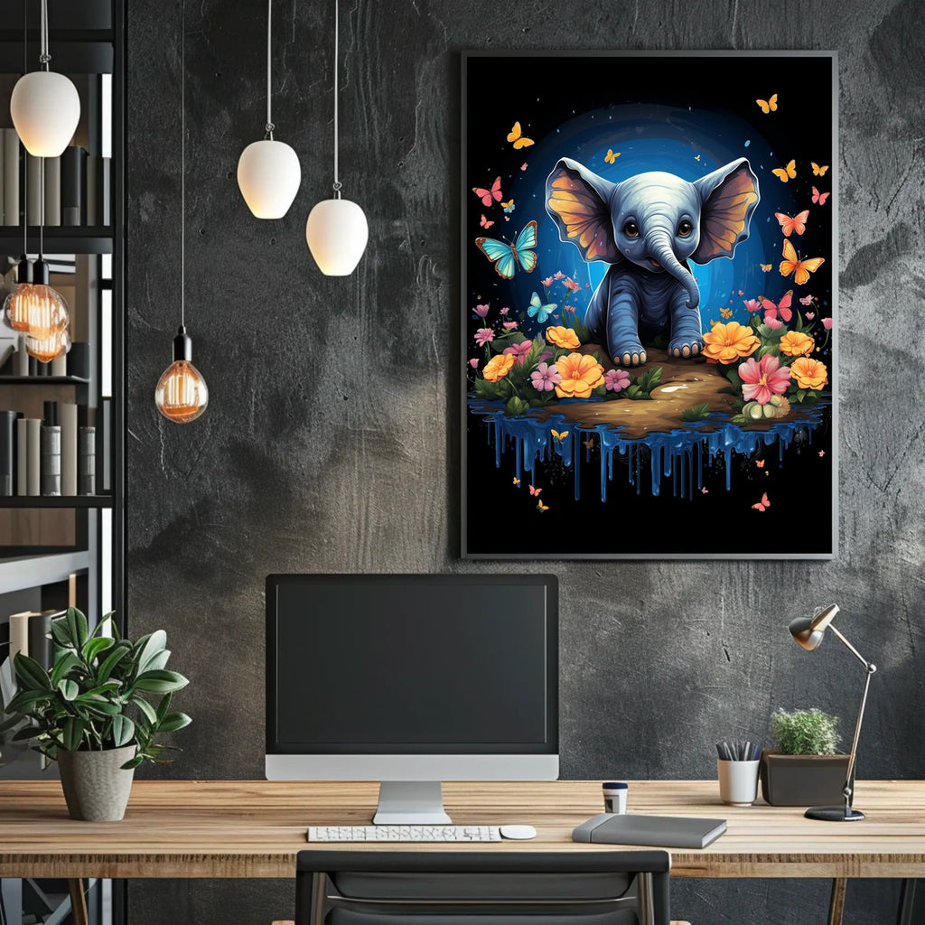 Immerse yourself in a magical journey with Enchanted Safari, where a lively elephant calf frolics among a dazzling array of vibrant blossoms and delicate butterflies. This whimsical artwork beautifully intertwines the wonders of nature, creating a captivating and dreamlike ambiance that brightens any room and sparks imagination.