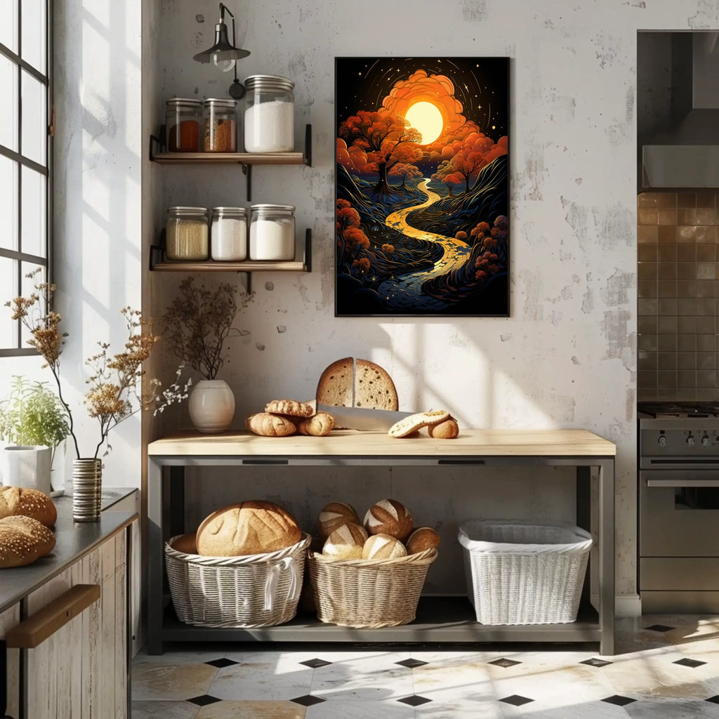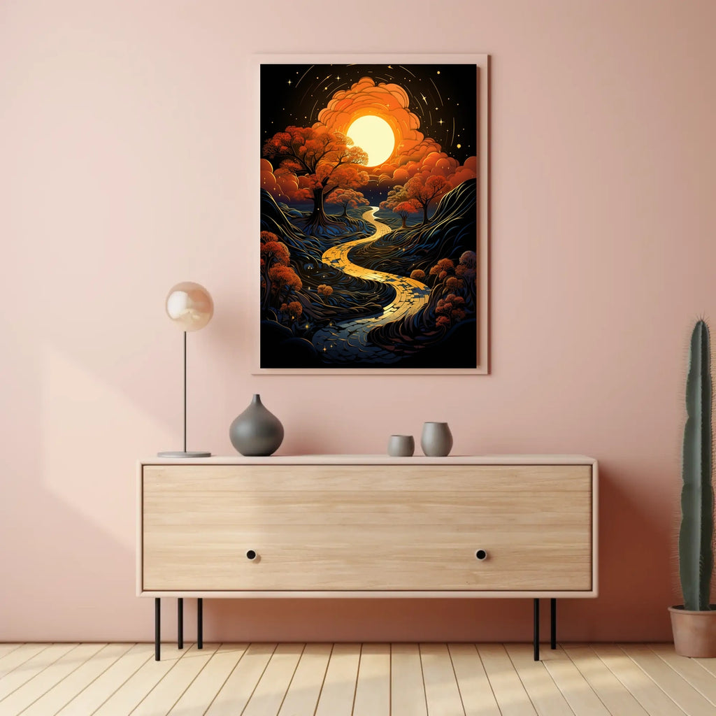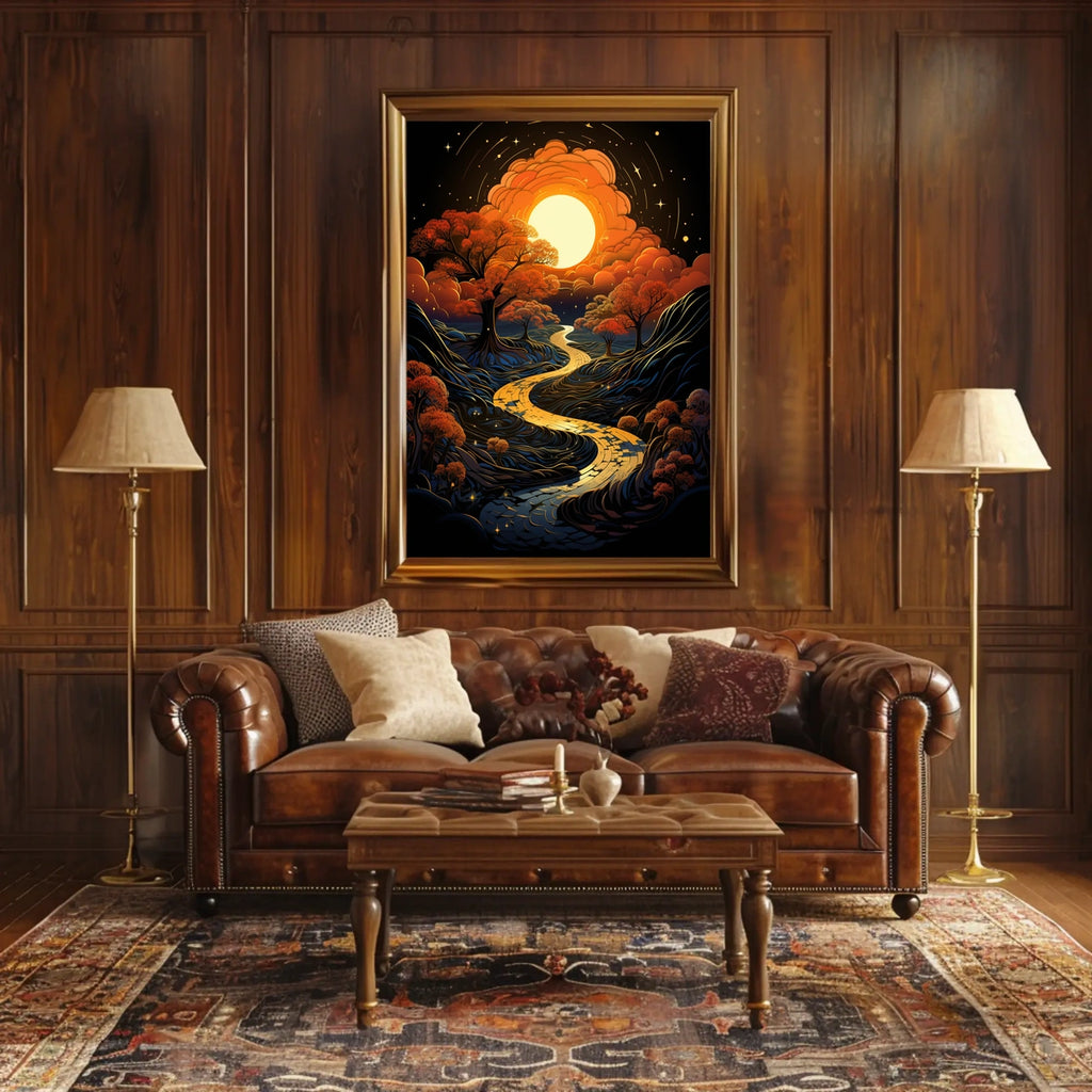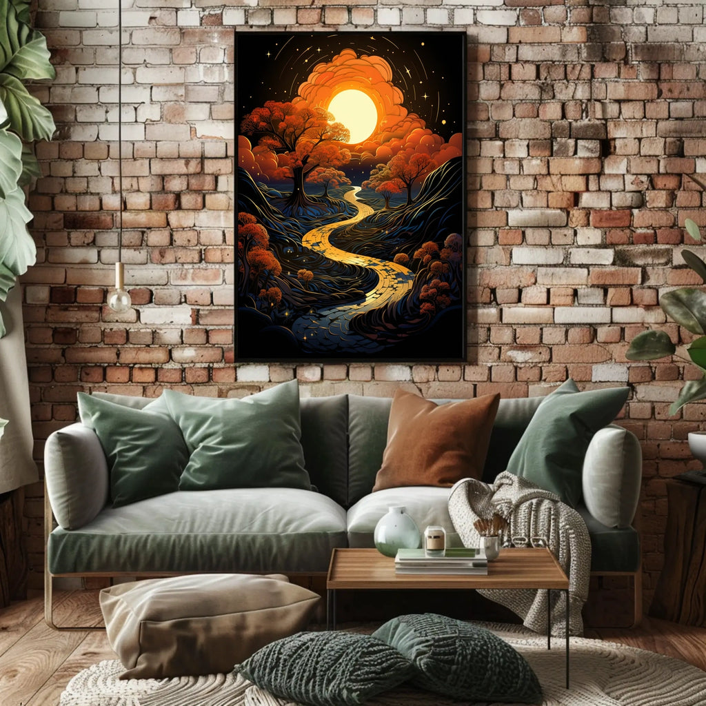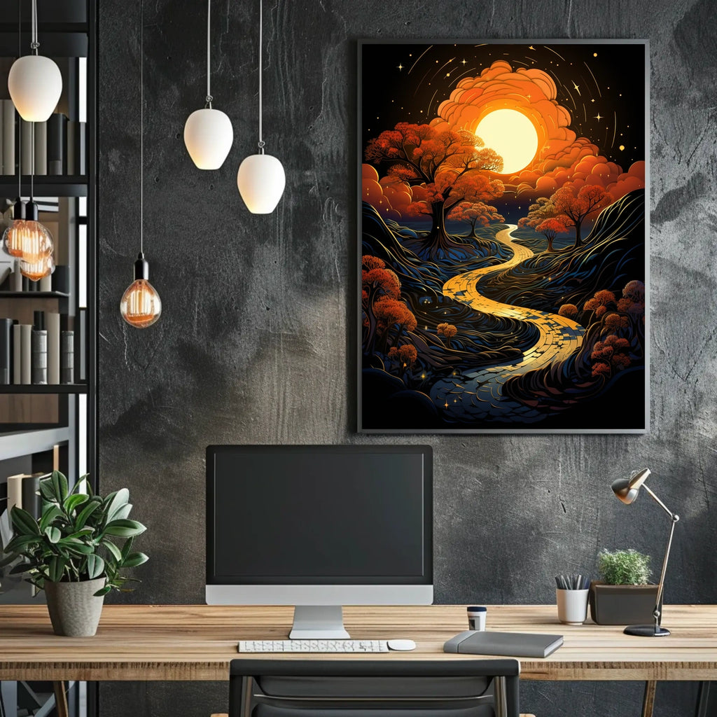 Step into a mystical realm with the Enchanted Twilight Path, where a golden pathway winds through a dreamlike landscape bathed in a radiant sun. This artful scene invites adventure, magic, and quiet awe, celebrating nature beauty while turning any room into a portal of imagination for everyday living.
