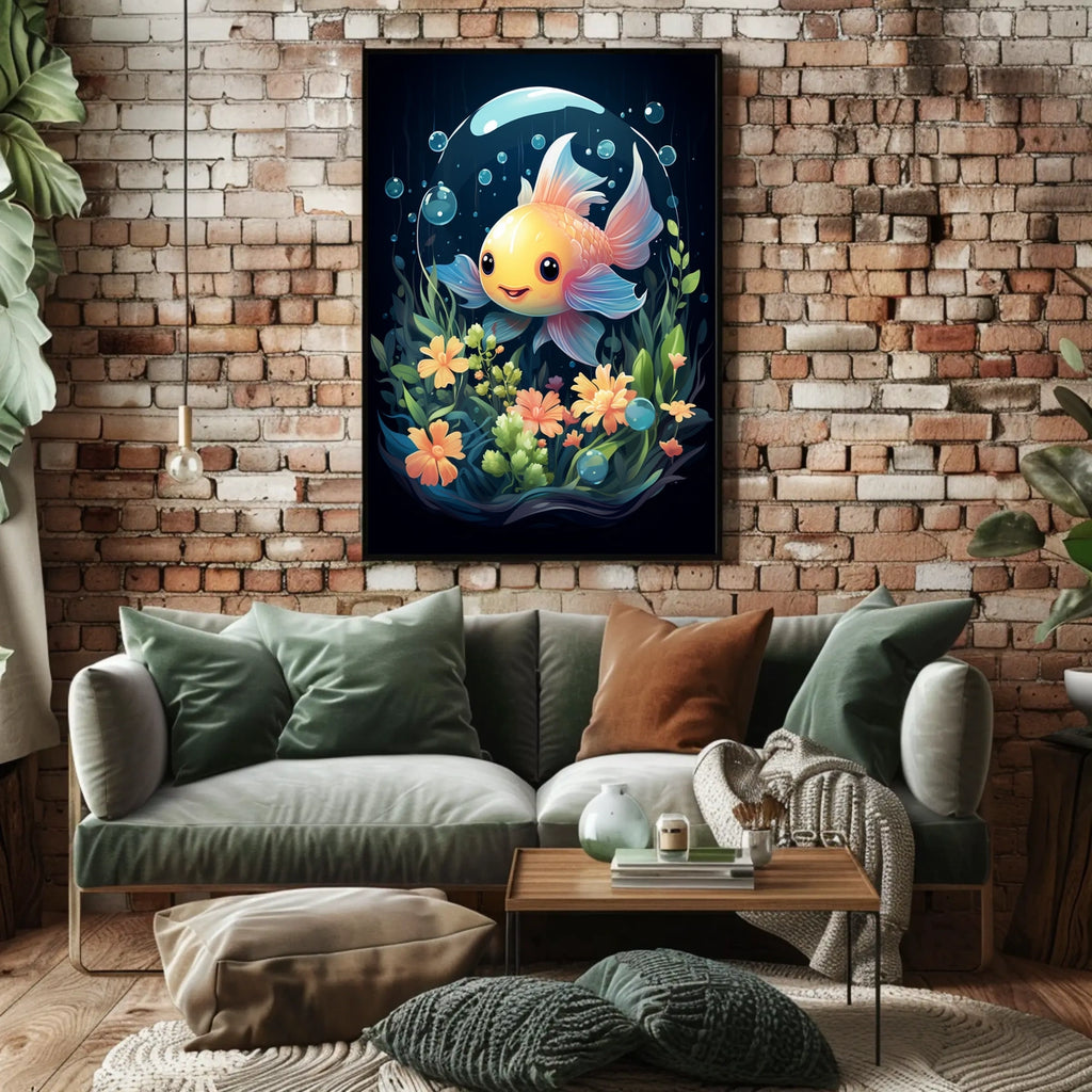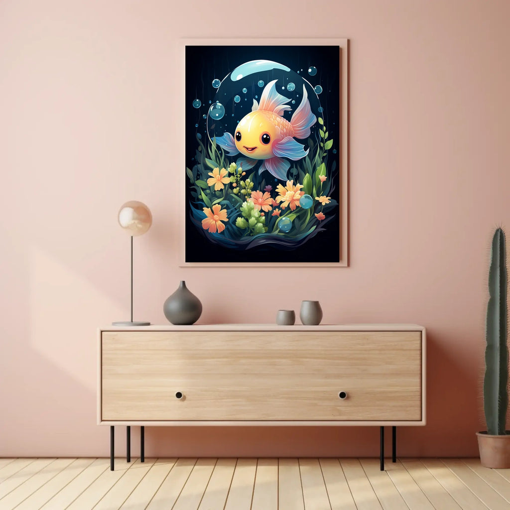 Immerse yourself in a whimsical underwater paradise with this vibrant poster. The artwork blends fantasy with the ocean's natural beauty, featuring a joyful goldfish surrounded by colorful blooms and bubbles. It adds magical charm and a playful, calming vibe to any space.