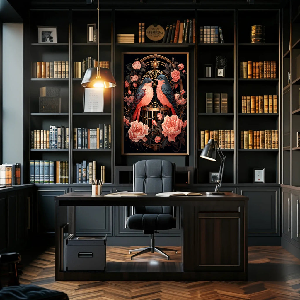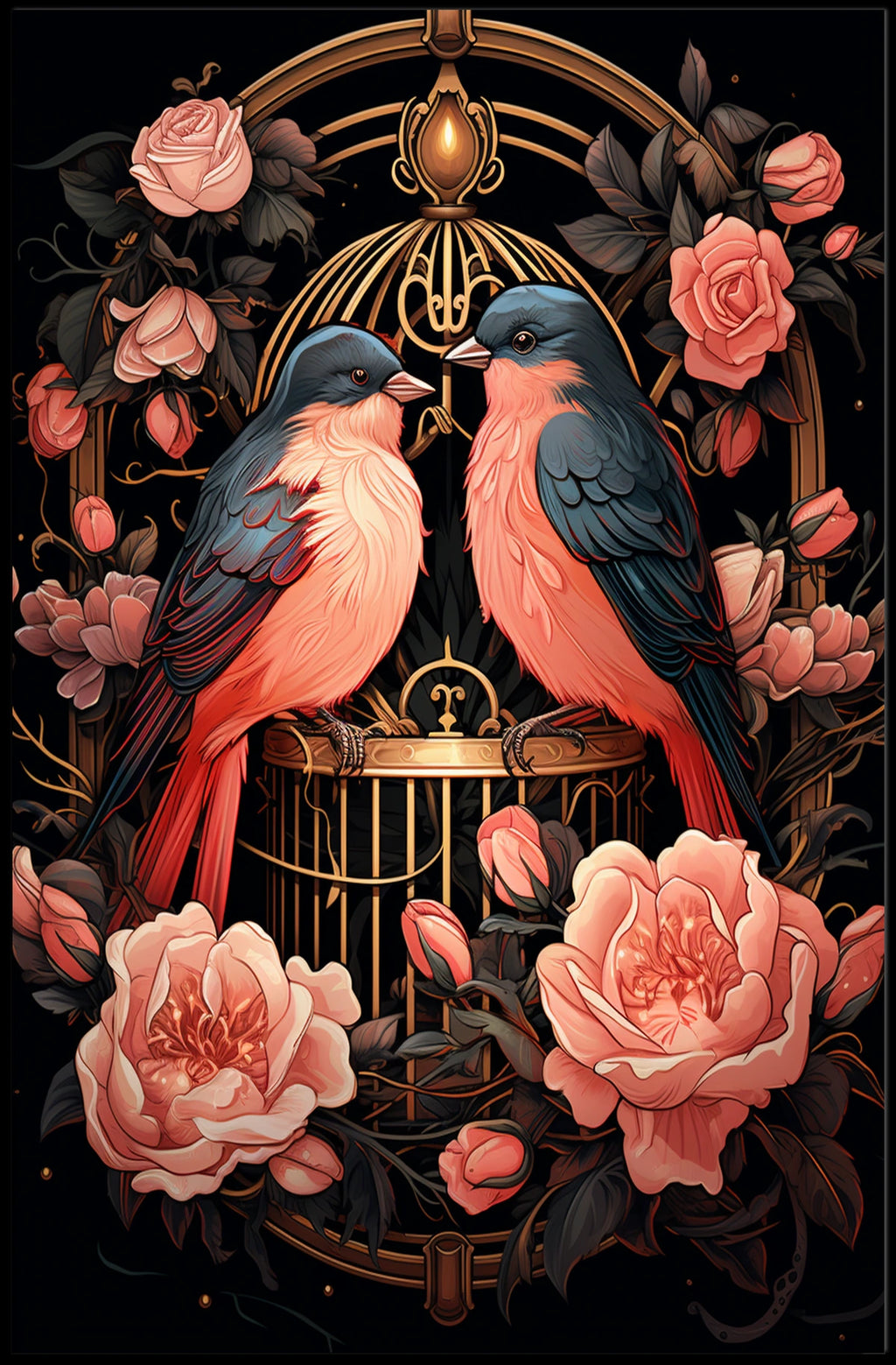 Transform your space with the Enchanting Birds and Roses Vintage Art Poster—a timeless decorative wall poster that celebrates nature and romance. This piece showcases two vibrant birds perched on an ornate golden birdcage, bringing a refined elegance to any room.