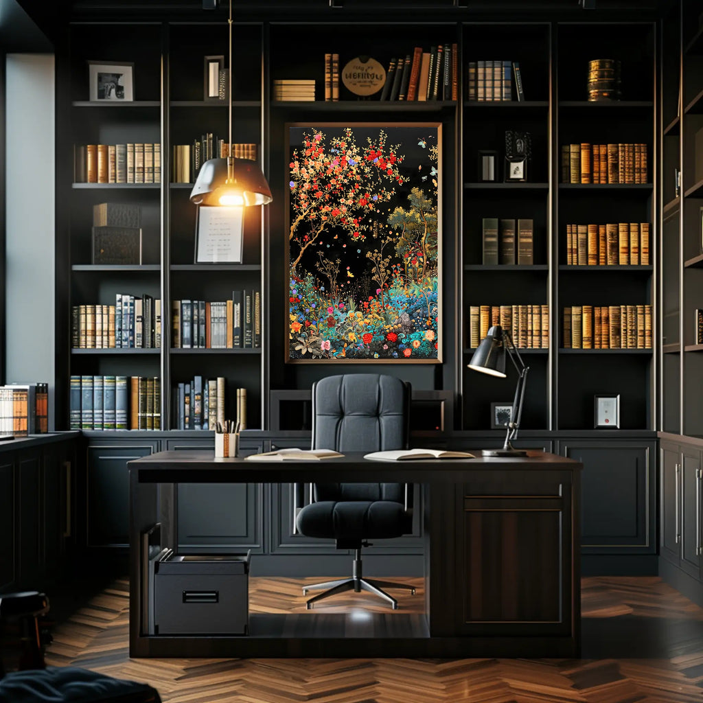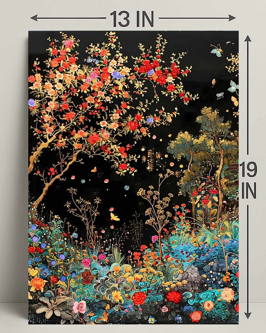 Enchanting Garden Scene by PosterGoat transforms any wall into a luminous, heritage-inspired sanctuary. This striking poster features a deep black backdrop that makes its ornate, photorealistic botanical illustration pop — a tapestry of vibrant flowers, gilded branches, delicate butterflies and intricate foliage that evokes traditional Asian garden art with a modern, decorative twist.