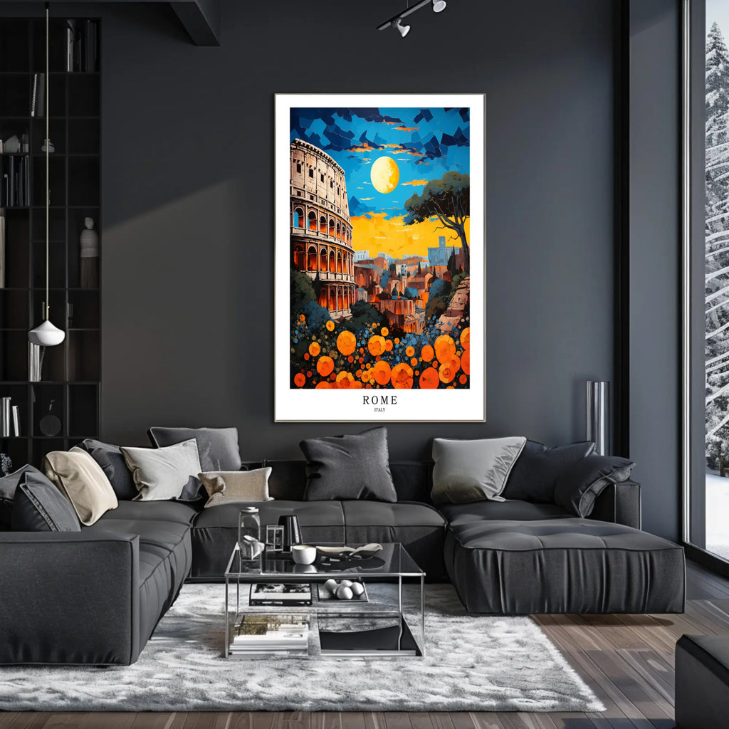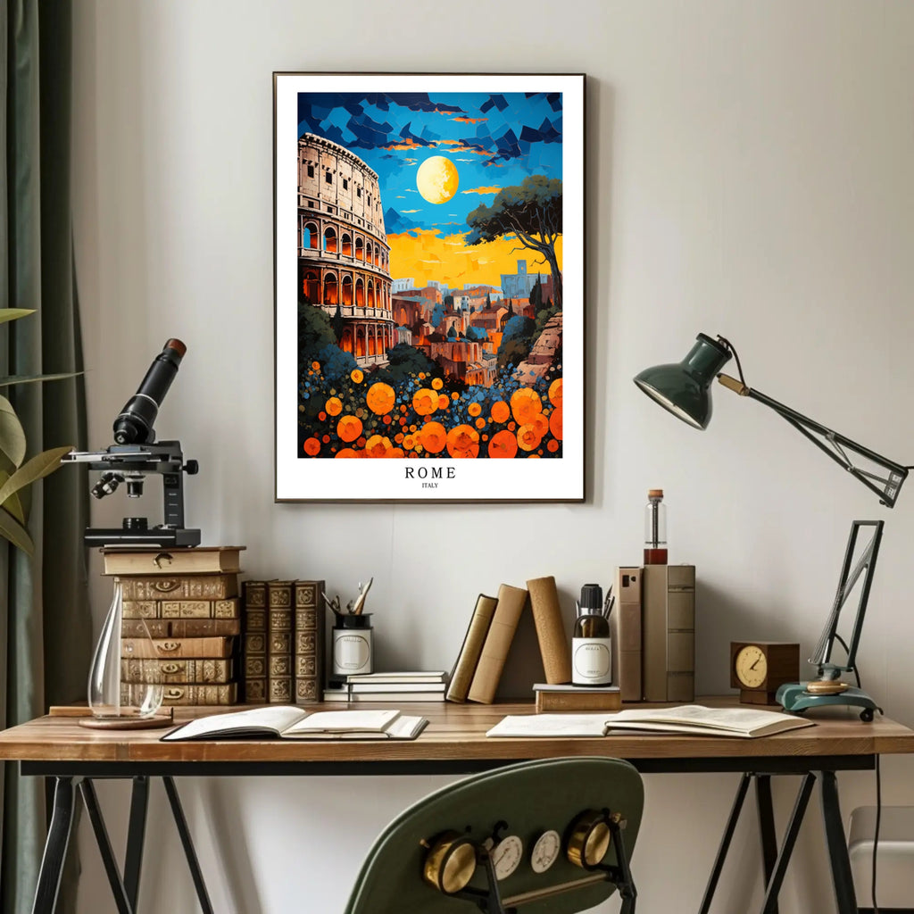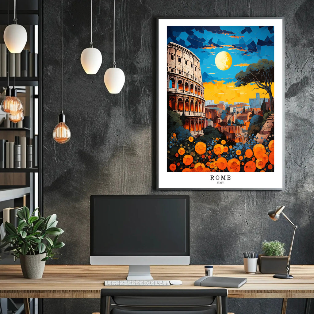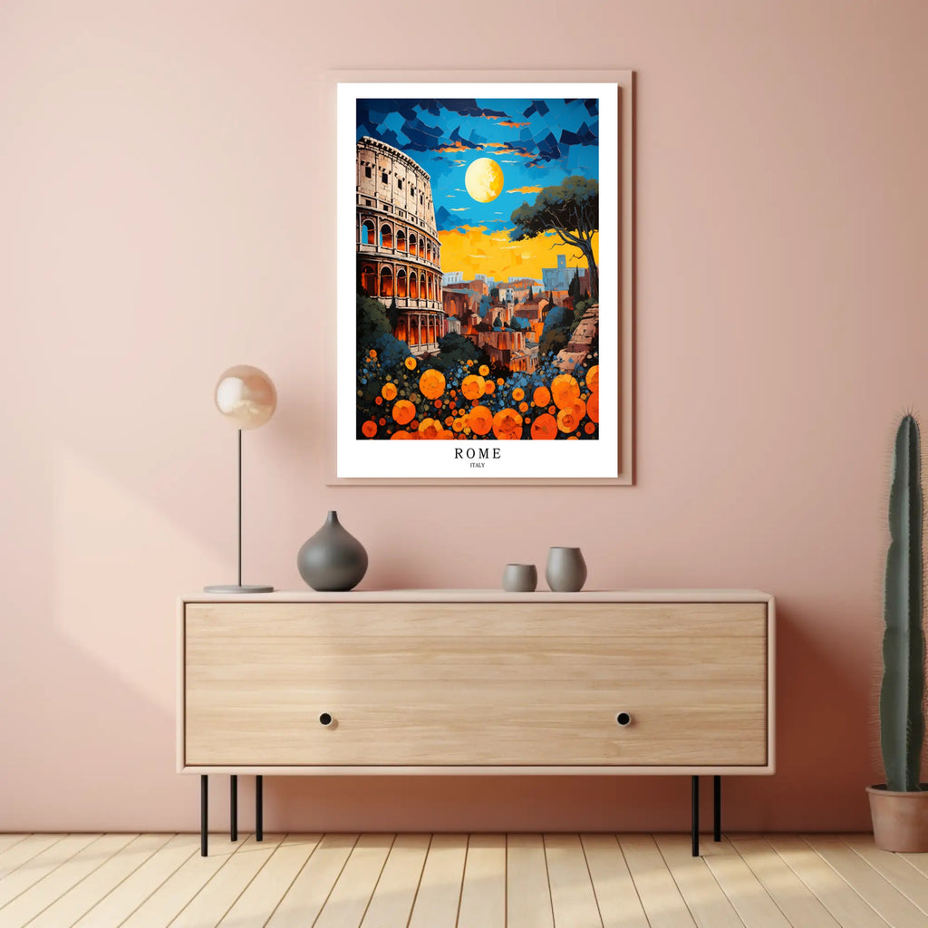 Enchanting Rome Poster from PosterGoat brings the romance of the Eternal City into your home with bold color, a striking mosaic-style sky, and an artful view of the Colosseum framed by glowing orange blooms and a full moon—perfect for decor lovers and wanderlust spirits.