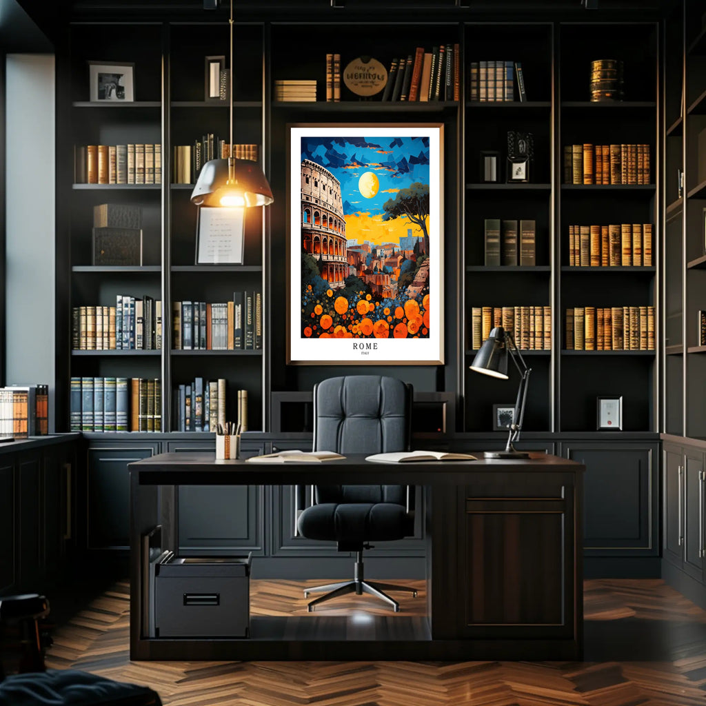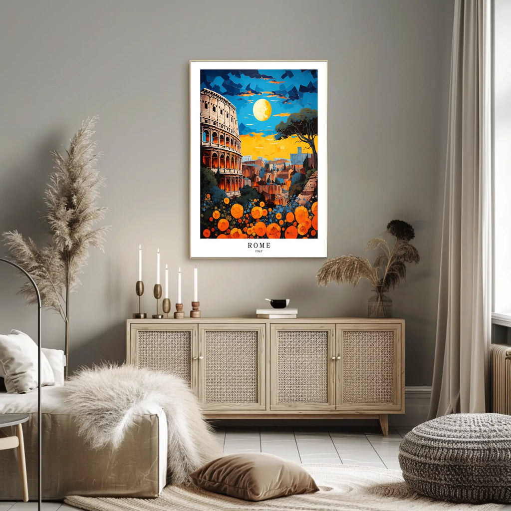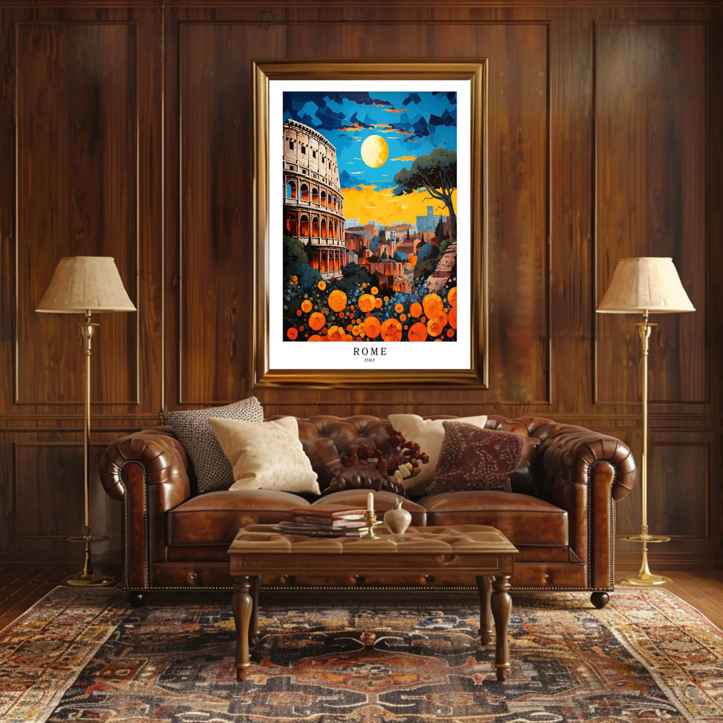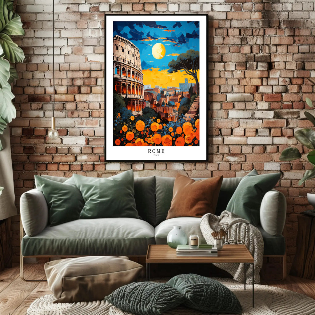 Enchanting Rome Poster from PosterGoat brings the romance of the Eternal City into your home with bold color, a striking mosaic-style sky, and an artful view of the Colosseum framed by glowing orange blooms and a full moon—perfect for decor lovers and wanderlust spirits.