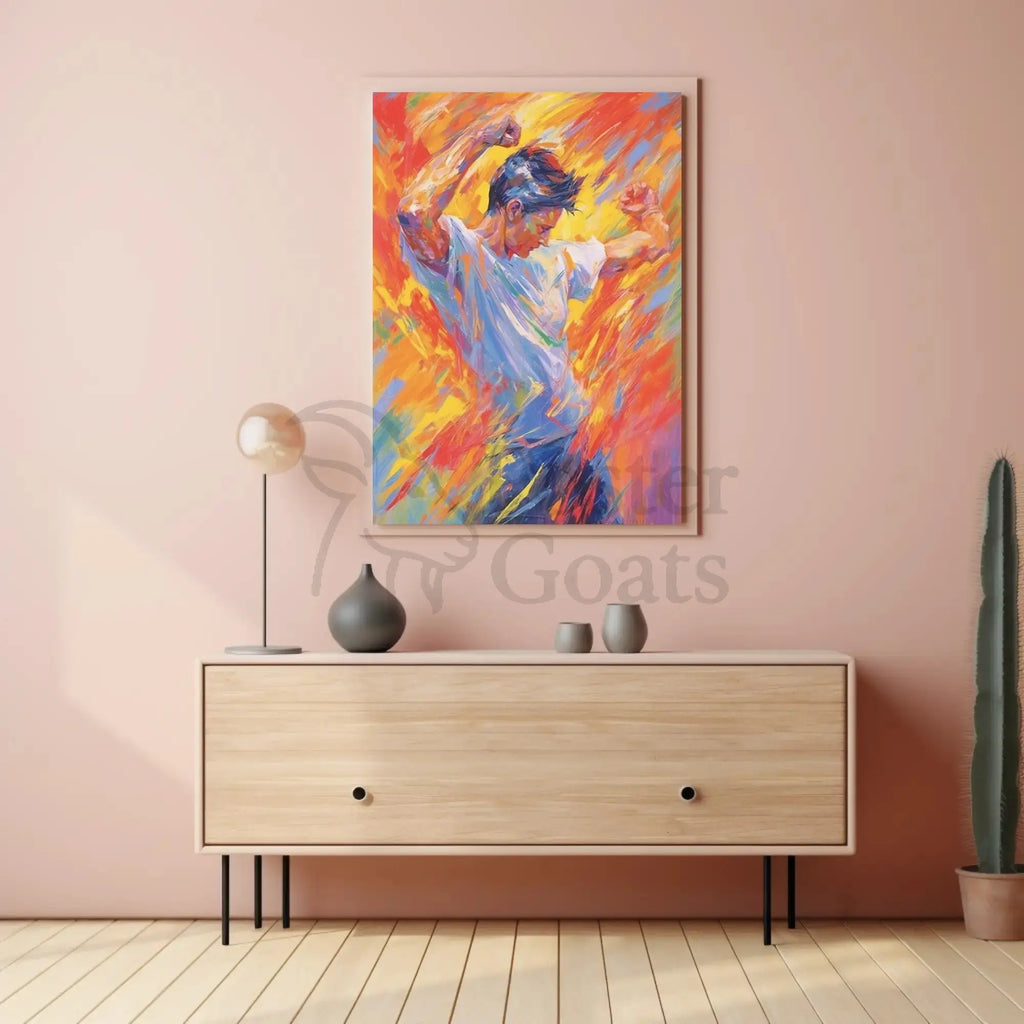 Energetic Expression in Motion Artistic Poster by PosterGoat brings movement and feeling to your walls with a burst of color and confident brushwork. This modern artwork captures a dancer-like figure mid-motion surrounded by vivid, sweeping strokes of orange, yellow, blue and red — an instant focal point that energizes living rooms, studios, or office spaces.