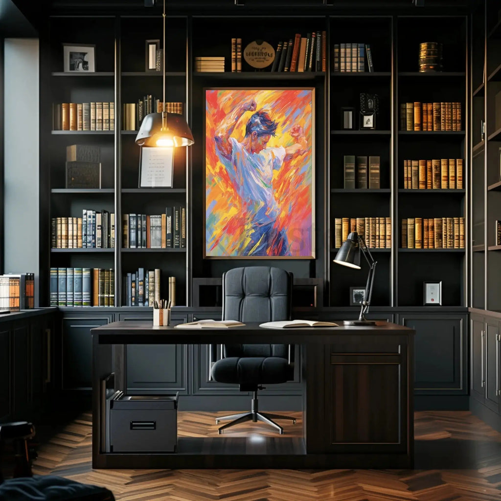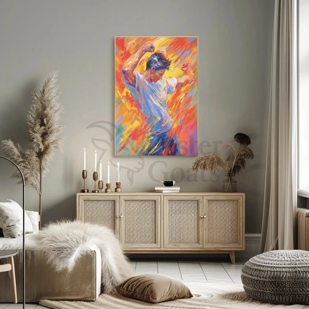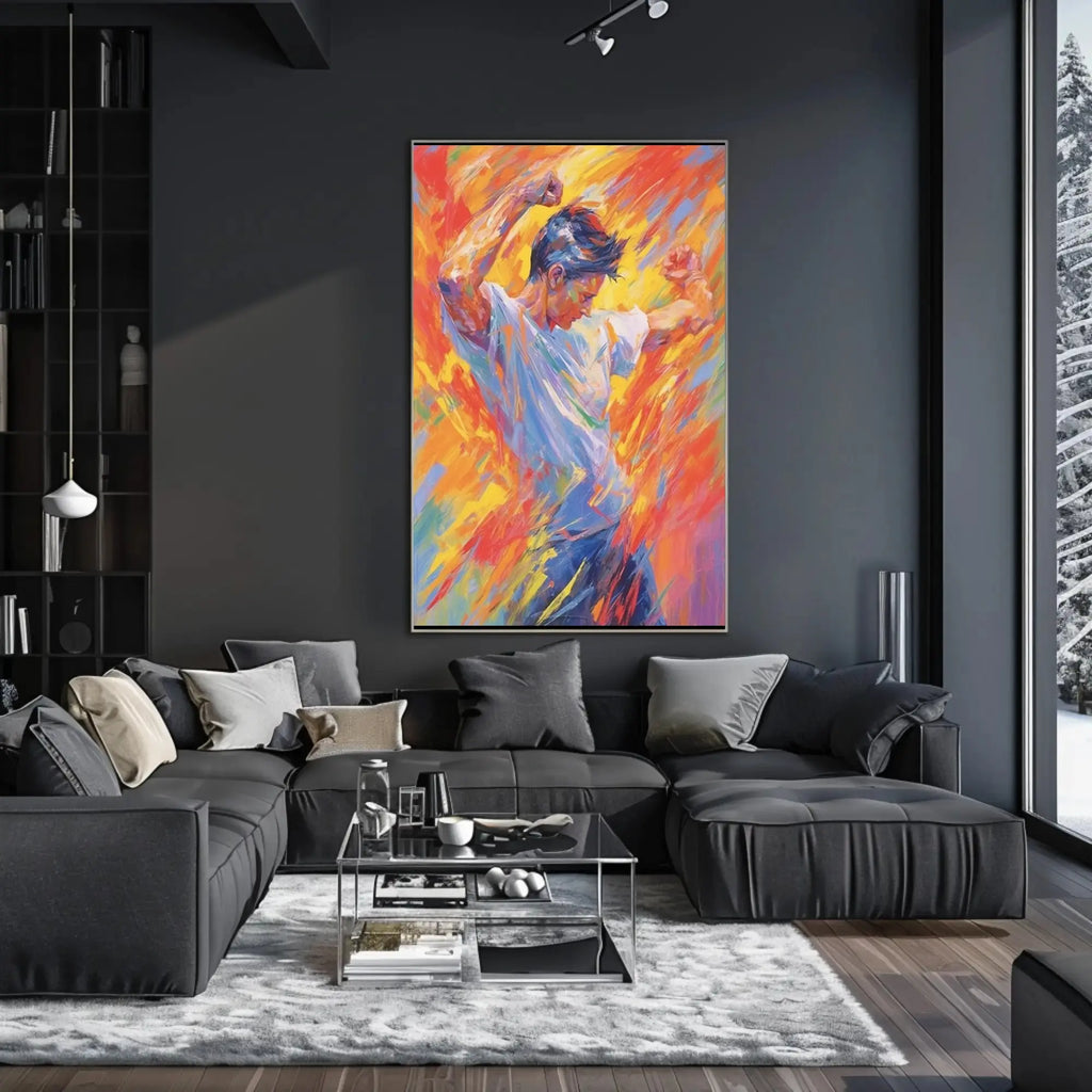- Dynamic composition: The figure’s pose and diagonal brushstrokes create a strong sense of motion that draws the eye and adds life to any room.
